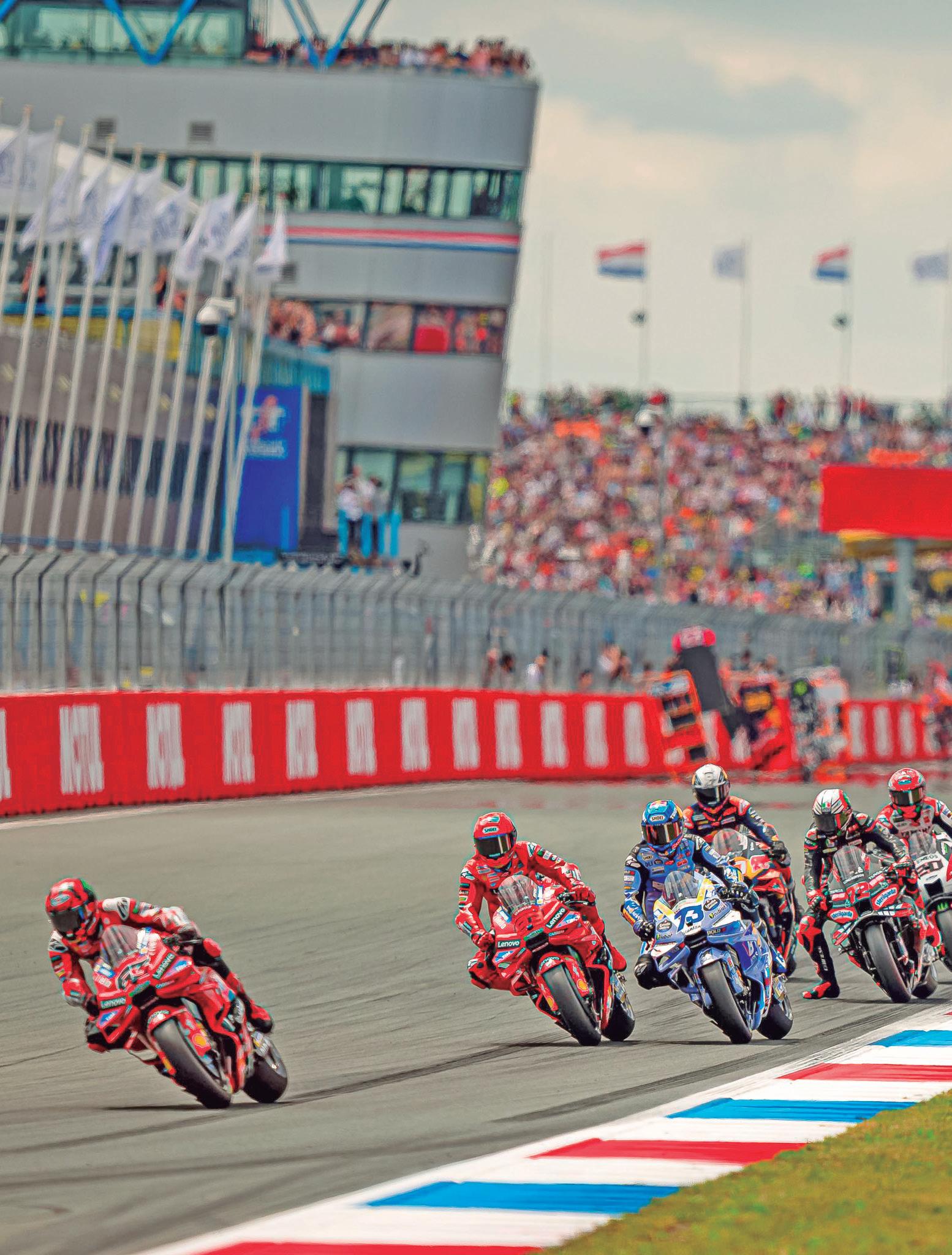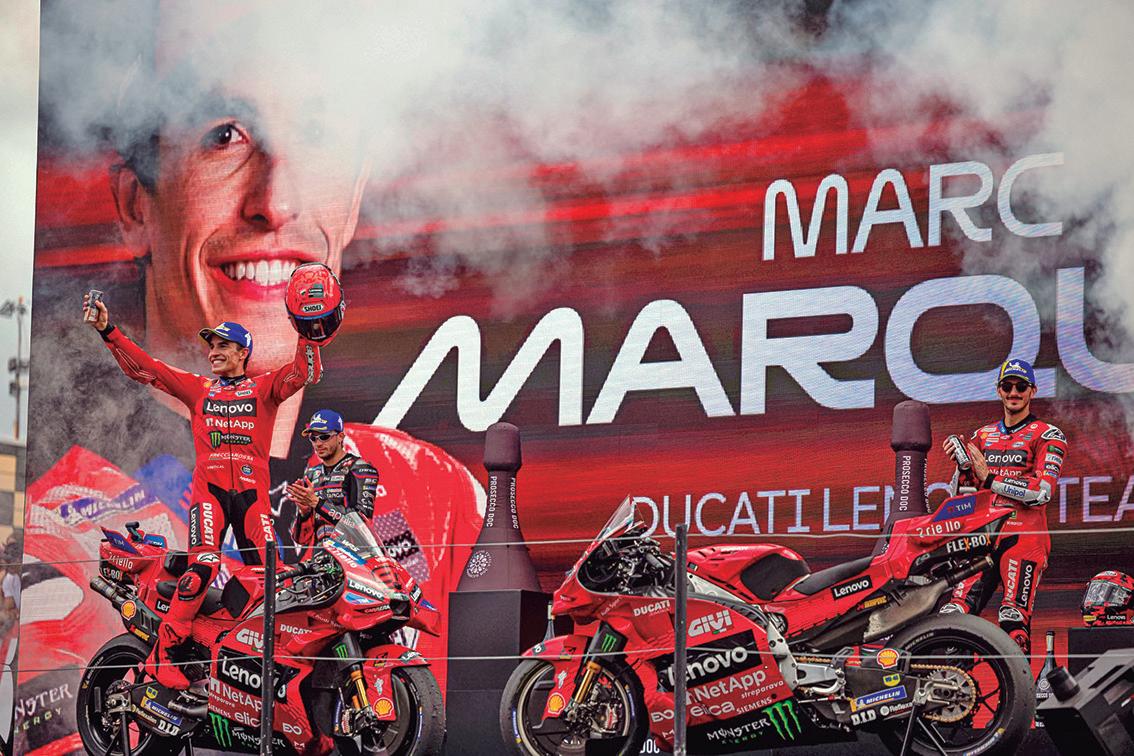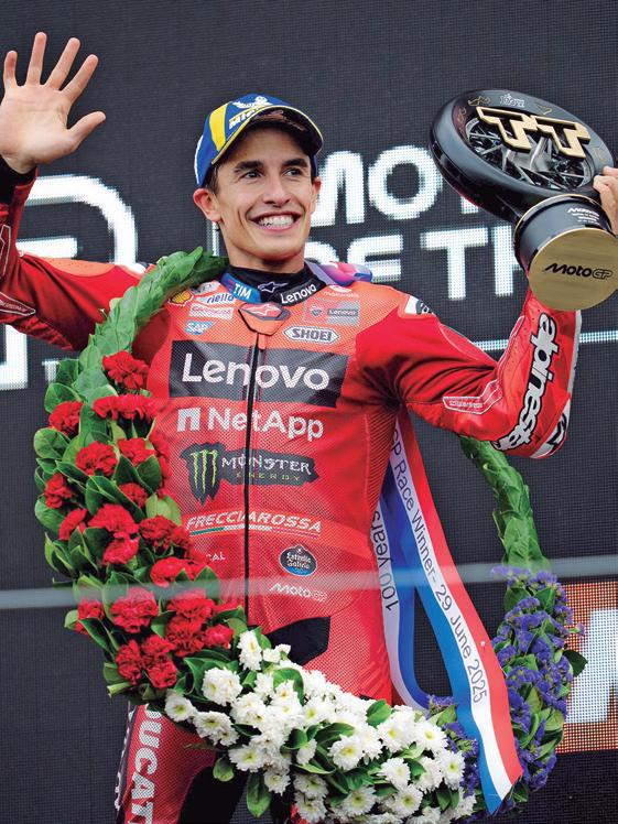 El piloto español Marc Márquez (Ducati), líder del campeonato de MotoGP, se impuso este domingo en el Gran Premio de Países Bajos, en Assen, durante la décima prueba del campeonato. Los italianos Marco Bezzechi (Aprilia) y Francesco Bagnaia (Ducati) completaron el podio, mientras que Álex Márquez (Ducati-Gresini), 2º en el campeonato, tuvo que abandonar la carrera tras una caída en la quinta vuelta. Con la del sábado, el catalán de 32 años suma ya 68 victorias en la máxima categoría e iguala el récord de la leyenda Giacomo Agostini. Sobre todo, su resultado unido al abandono de su hermano y a la discreta carrera de Bagnaia, le permite aumentar más aún su liderato en el campeonato. / AFP