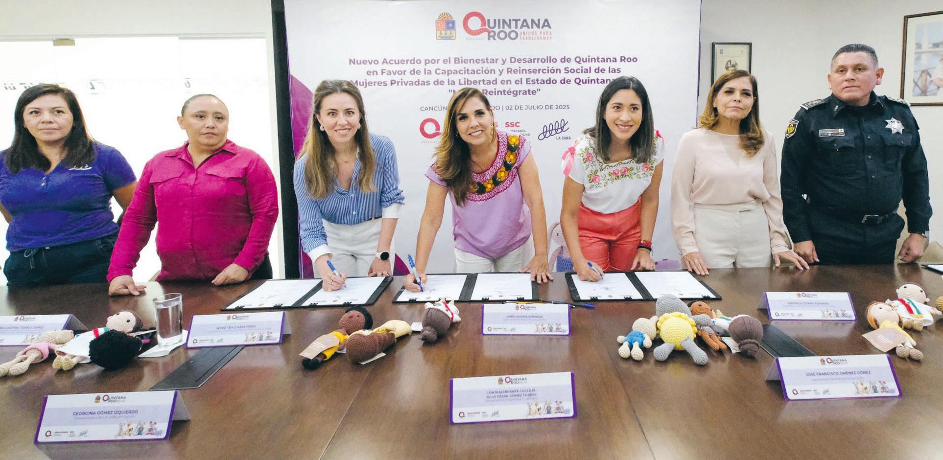 Para fortalecer la reinserción social de mujeres privadas de la libertad en Quintana Roo, la gobernadora Mara Lezama Espinosa encabezó la firma del Nuevo Acuerdo por el Bienestar y Desarrollo, que busca brindar herramientas de capacitación laboral, independencia económica y apoyo psicológico a las internas, como parte del programa “Mujer Reintégrate”.
