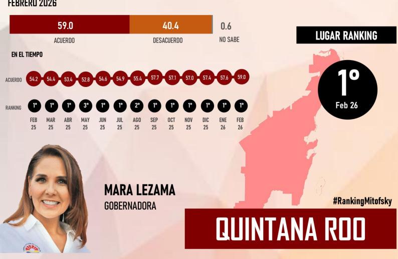La gobernadora de Quintana Roo sube a 59% de aprobación y se mantiene como la mejor evaluada del país tras 42 meses de gestión LOCAL P. 6