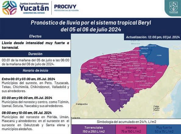 intensas en Yucatán y lluvias muy fuertes en Campeche. Habrá un oleaje de cuatro a seis metros de altura, con posible formación de trombas marinas en las costas de Quintana Roo y Yucatán. Se prevé que el huracán Beryl toque tierra como categoría dos