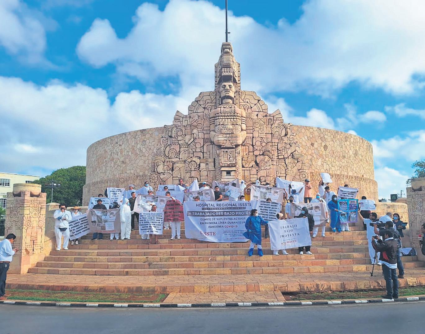 HÉROES DEL COVID. Más de 40 trabajadores suplentes del ISSSTE se manifestaron en el monumento a la Patria, porque a 4 años de que estuvieron al frente de la pandemia no han recibido su basificación, incluso señalan que hay quienes tienen que esperar 3 meses por su quincena. YUCATÁN P. 3