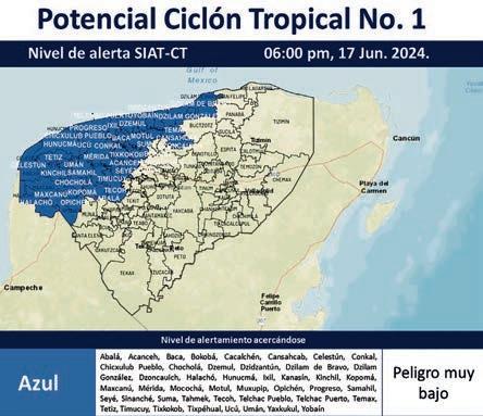 Un total de 46 municipios del poniente de Yucatán, entre los que figura Mérida, fueron declarados en alerta Azul de riesgo bajo por la Coordinación Nacional de Protección Civil como medida preventiva para que la población se mantenga atenta a la información meteorológica y del comportamiento de un potencial ciclón tropical.