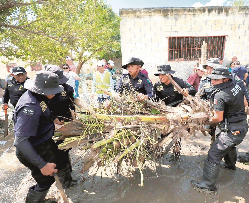 CELESTÚN. Elementos de la Policía Estatal y del Ejército Mexicano coordinan labores para limpiar las calles y carreteras del municipio, afectado por el paso del huracán Milton P. 5