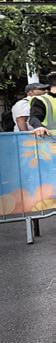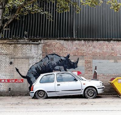 El lunes, un rinoceronte recién reivindicado por Banksy, que parecía subirse a un coche abandonado, fue pintarrajeado por un hombre que llevaba un pasamontañas.