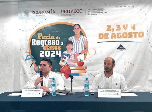 TAREA. El director de Profeco en Yucatán, Esaú Velázquez, y el presidente del CCE en Yucatán, Levy Abraham Macari, dieron detalles del evento que organizan. injustificados en los precios. El objetivo de la feria es apoyar la economía de las familias yucatecas que deben adquirir útiles escolares, ropa y calzado para el próximo ciclo escolar, que iniciará el 26 de agosto. En el Centro de Convenciones de Canaco de Mérida, se ofrecerán papelería, librería, útiles escolares y deportivos, mochilas, calzado, equipos de cómputo y servicios de