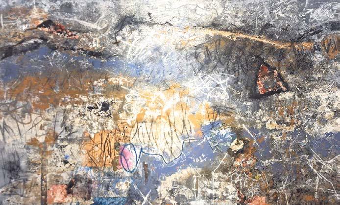La exhibición incluye 55 piezas entre pinturas y esculturas, resultado de la combinación de sus recuerdos, fotografías e investigaciones. Los paisajes de ríos, volcanes, cascadas y cielos nublados cobraron vida en su taller mediante materiales poco convencionales.