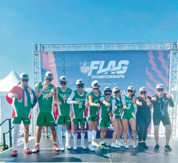 nardo Díaz, Nicolás Pérez, Santiago Barrera, Davis Uguez y Edgar Rodríguez, quienes previamente conquistaron el torneo nacional en Monterrey para poder representar a México en Estados Unidos. Durante el torneo, México logró en tres encuentros blanquear a sus rivales, tras ganar 28-0 a Alemania y con similar marca de 32-0 a Reino Unido y China, mientras que a los representantes de Australia los dejó en el camino 36-8. El director de NFL México, Arturo Olivé, felicitó al combinado tricolor por su participación como represen-