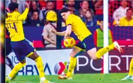material analizado. En dicho análisis se establece que el cuerpo arbitral en campo y en desde el VAR en las instalaciones de la Femexfut usaron consideraciones reglamentarias incorrectas, al definir la jugada como un “error conceptual al estimar que el toque que se produce con ambos brazos del defensor de América es produc-