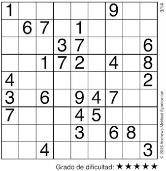 Complete el recuadro de tal manera que cada fila, columna y cuadro de 3x3 tengan los números del 1 al 9.