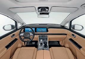 Cabina aislada acústicamente, tiene 3 filas de asientos eléctricos, ventilados y calefactados con masaje, los traseros con carril de deslizamiento. Volante con ajustes y controles de audio y navegación y una pantalla central de infoentretenimiento con conectividad inalámbrica Android Auto y Apple CarPlay.