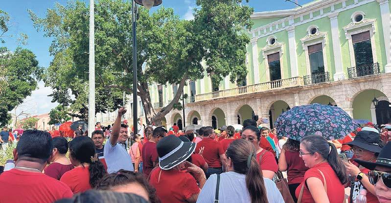 maestros integrantes del Consejo Central de Lucha de Yucatán se manifestaron este jueves frente al Palacio de Gobierno de Mérida, exigiendo la derogación de la Ley del ISSSTE promulgada en 2007.
