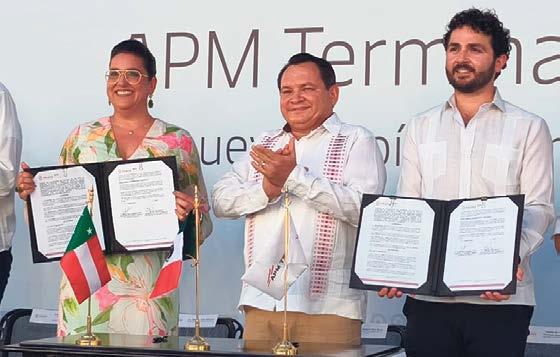 Teniendo como escenario este importante puerto yucateco, el gobernador y la capitana Claudia Hernández Soto, en representación de la Coordinación de Puertos y Marina Mercante de la Secretaría de Marina, fueron testigos de honor de la firma del acuerdo de entendimiento entre Beatriz Yera Selbaine, directora general de APM Terminals México, y la secretaría de Economía y Trabajo (SETY), a través de su titular Ermilo Barrera Novelo.