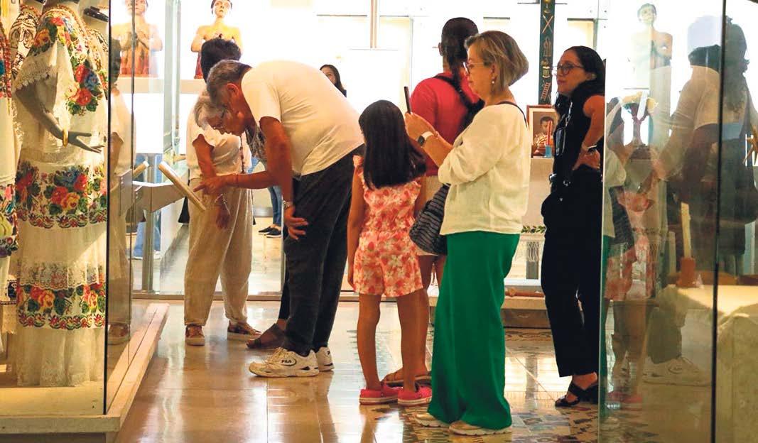 ver a los mayas como gente de piedra, porque muchas veces se les da más valor a las estructuras que al maya vivo”, expresó el director deneral de Museo y Patrimonio, Fidencio Briceño Chel, al dar la bienvenida al Museo de Noche. Un recorrido por la noche, con acceso totalmente gratuito, y la exposición del mural TresEtapas delaHistoriadelPuebloMaya, de Fernando Castro Pacheco, atra-