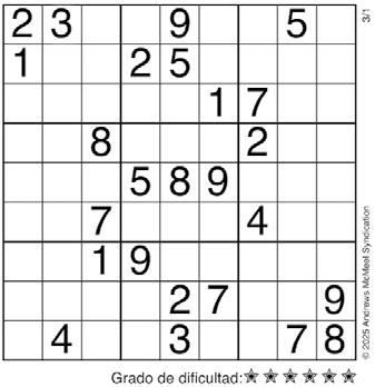 Complete el recuadro de tal manera que cada fila, columna y cuadro de 3x3 tengan los números del 1 al 9.