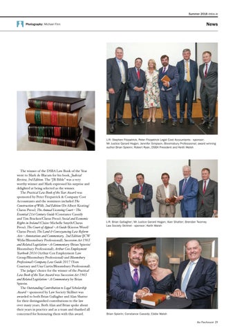 The winners of the 2018 DSBA th Annual Law Book Awards were announced at an awards ceremony in June. Our congratulations are extended to the winners, and also to the shortlisted nominees in what was a crowded field of outstanding authors. The current range of legal textbooks available to assist practitioners is of the highest standard. Our congratulations to Mark de Blacam SC for his superb Judicial Review book and to Brian Spierin SC for his winning book on the Succession Act 1 and related legislation. On the night, it was a fitting honour for the DSBA to bestow recognition on Brian Gallagher and Alan Shatter for their outstanding contribution to the law. They have made immense contributions.