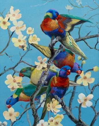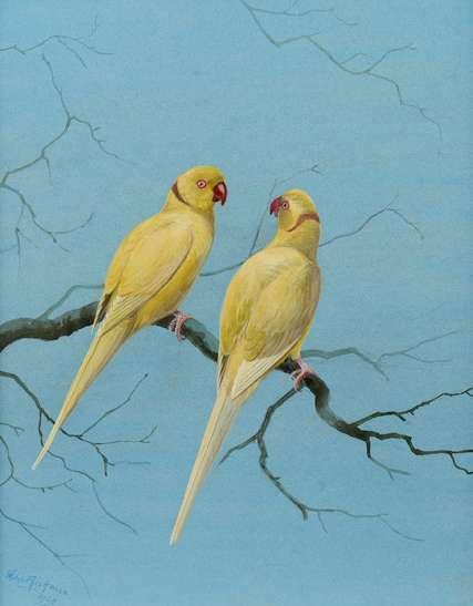 TEN PARROTS IN FIVE FRAMES, INCLUDING EIGHT ROSELLA AND TWO LUTINO RINGNECK PARROTS four signed and dated Philip Rickman 1968, one unsigned all watercolour and gouache on blue paper each 49 x 38cm; 19 1/4 x 15in 60 x 49.5cm; 23 1/2 x 19 1/2in (framed) (5)