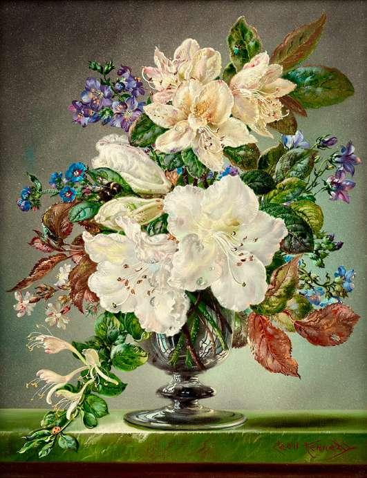 STILL LIFE WITH LILIES, ROSES, LILAC AND CARNATIONS IN AN URN titled, inscribed and incompletely dated Pottier / Belin de Fontenay / 160 on an old label on the reverse oil on canvas