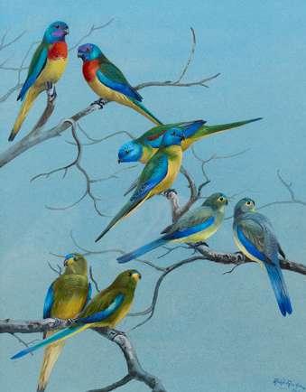 TWENTY-TWO PARROTS AND PARAKEETS IN SIX FRAMES, INCLUDING THE MALLEE RINGNECK, PAPUAN KING, ELECTUS AND ROSELLA PARROTS each signed and dated Philip Rickman 1969 each watercolour and gouache on blue paper