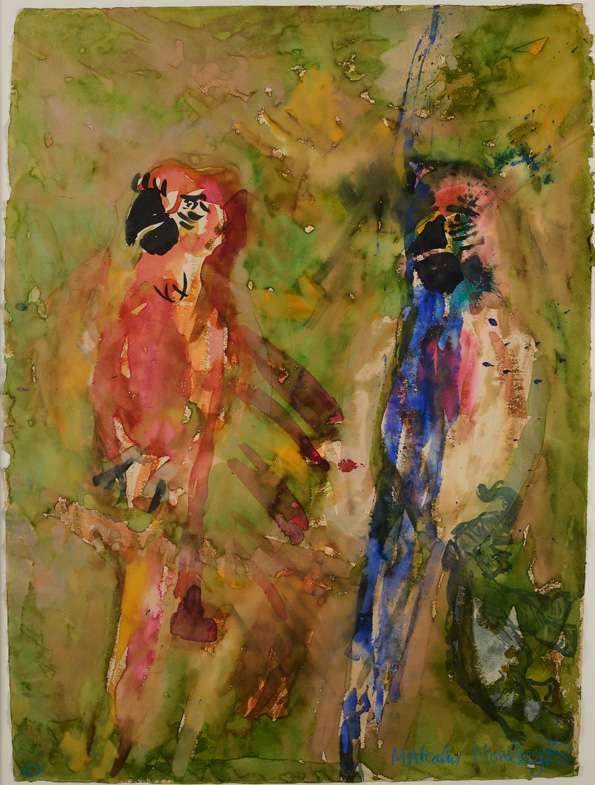 TEN PARROTS IN FIVE FRAMES, INCLUDING EIGHT ROSELLA AND TWO LUTINO RINGNECK PARROTS four signed and dated Philip Rickman 1968, one unsigned all watercolour and gouache on blue paper each 49 x 38cm; 19 1/4 x 15in 60 x 49.5cm; 23 1/2 x 19 1/2in (framed) (5)