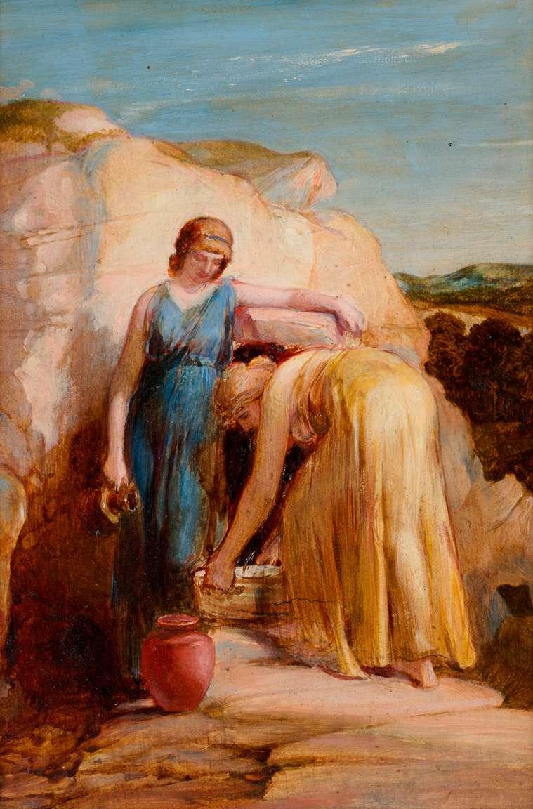 GIRLS AT A SPRING, A RECOLLECTION FROM NATURE signed and titled recollections from Nature / Geo Richm […] on a fragment of the original label on the reverse; inscribed Girls at a Spring / a recollection from Nature / by George Richmond. R.A. / from his collection on another label on the reverse oil on panel