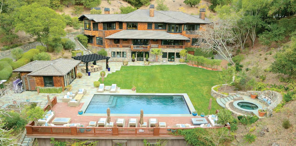 Majestic, parklike estate. ±9500 sf European-style residence with Mt. Tam views on ±1.42 acres. Two-story entry & staircase of Italian marble designed and installed by European artisans, formal living room with fireplace, terrace overlooking the pool, spa & grounds. Pool level includes wine cellar, cabana with bath, second kitchen and pantry. 4 bedrooms, 5 full & 3 half baths… $7,500,000