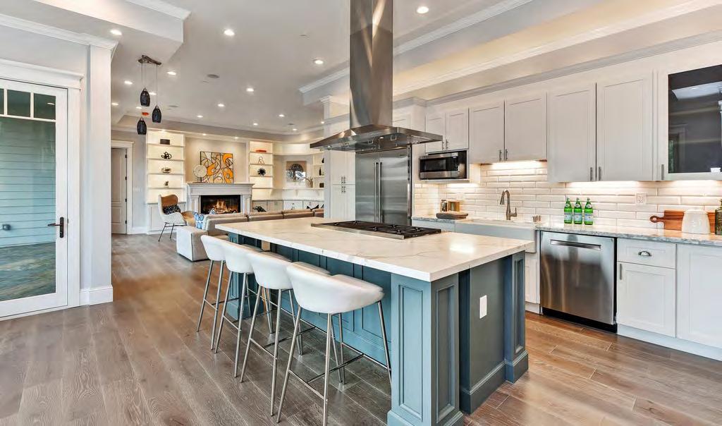 The family’s now open-concept kitchen features custom cabinets and premium appliances, including a Rocket Espresso machine. “This was Nolan’s purchase,” Wolfe says. “He said, ‘Before you spend more on furniture, I want to splurge on a machine that makes