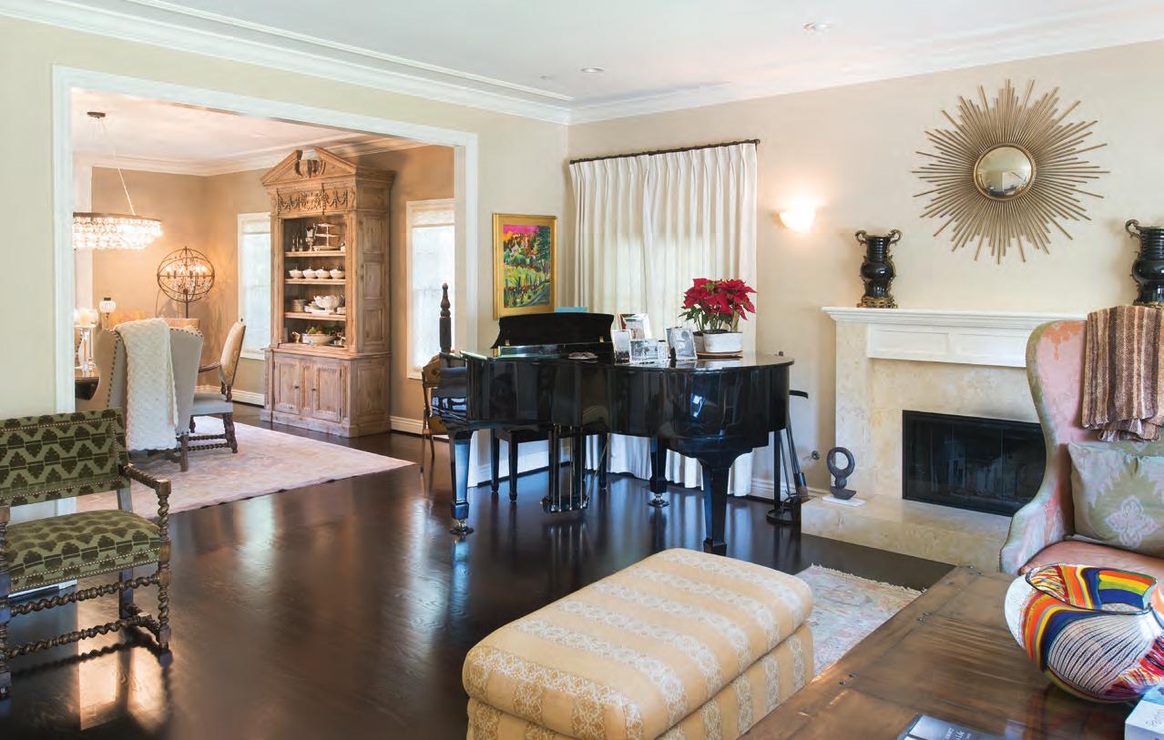 In the living room, for example, she’s combined a grand piano (covered in silver-framed family photos) with a leather-cushioned wingback chair custom-made at the Paci fic