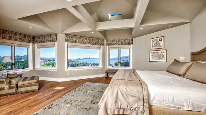 bedroom, 3.5 bath residence offers comfortable luxury living and breathtaking panoramic views of the San Francisco skyline, Bay Bridge, Angel Island and the East Bay. The contemporary home comprises three levels with views from nearly every room. In addition to formal living and dining spaces, an elegant open concept chef’s kitchen boasts a large center island, a breakfast area and top-of-the-line appliances, and is connected to the outside terrace by French doors for exceptional indoor/outdoor flow. The full-floor master suite has vaulted ceilings, a spa-like bathroom with soaking tub and a spacious walk-in closet. There is also an en suite bedroom with private balcony ideal for guests. The view-side of the house features a large wrap-around deck that overlooks a level lawn for outdoor activities, as well as an outdoor doggie shower. Captivating views, easy access to hiking trails and the Ring Mountain Open Space Preserve, and flowing indoor/outdoor living make this home perfect for family gatherings and entertaining.