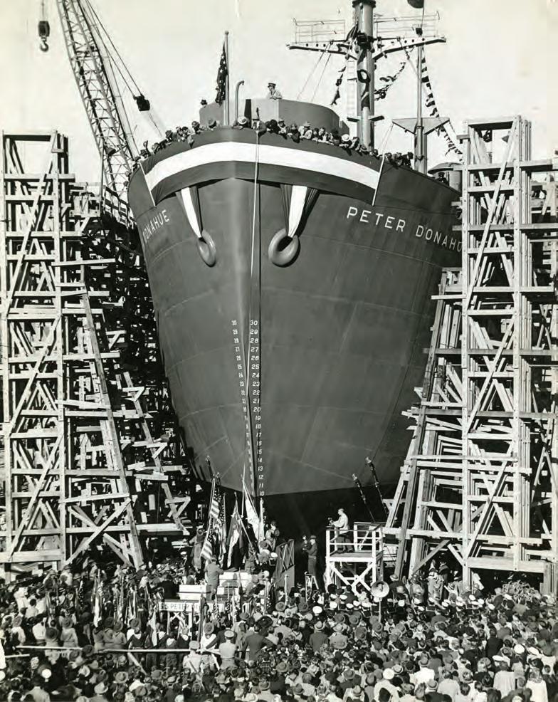 THIS 1943 PHOTO has double the Marin County history. First, the shipyard is Marinship, a rapidly constructed facility on Richardson Bay in Sausalito. A typical day at Marinship saw 20,000 workers, many of them women, reporting for work on one of three eighthour shifts. During three-plus years of around-the-clock production, Marinship produced 93 oceangoing vessels, most of which were Victory and Liberty ships (the restored Jeremiah O’Brien, berthed at Fisherman’s Wharf, is a Liberty ship). Liberty ships were 440 feet long, traveled at 11 knots and brought cargo, food and ammunition to various theaters of war. President Franklin D. Roosevelt nicknamed them the “Ugly Ducklings” of World War II. Regardless, the 12th of 15 Liberty ships launched at Marinship was christened the Peter Donahue — the second Marin County tie-in in the photo. Donahue was born in 1822 in Glasgow, Scotland, of Irish parents, who brought him to America as a youngster. When he was 30 he started a San Francisco gas company that eventually became PG&E. His Marin endeavors involved launching the Northern Pacific Railroad, which starting in 1884 was based in Tiburon. Donahue was behind the building of not only many of the railroads that connected Marin County with points as far north as Eureka, but also huge ferryboats, such as the Eureka, which could transport more than 1,000 passengers and 10 freight cars from Tiburon to San Francisco (the restored Eureka is berthed at the Francisco Maritime National Historical Park). With such an important maritime history, it is fitting that a World War II Liberty ship be named the Peter Donahue. m