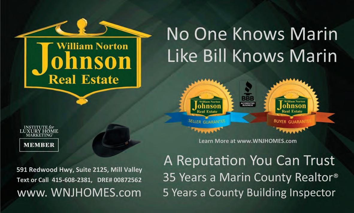 Mill Valley | $1,595,000 Charming 4br/2ba fixer w/legal cottage. Susan Coleman 415.925.3264 Coleman.Susan@comcast.net CalRE#01336715 COLDWELLBANKERHOMES.COM San Rafael | $1,149,000 Beautiful 3br/2.5ba Lucas Valley Estates home w/incredible views. Shari Wilkins 415.328.2323 Shari@NBayHomes.com CalRE#01194450 San Rafael | $899,000 Beautiful 3br/3ba condo w/high ceiling, decks and views. Jola Marra 415.257.2016 jolamarra@outlook.com CalRE#01710099 Novato | $560,000 Well-maintained 2br/2.5ba home w/remodeled kitchen and pool. Toni Shroyer 415.640.2754 ToniShroyer@hotmail.com CalRE#01876201 Novato | $998,000 Legacy property on approx. ½ acre lot near downtown Novato. Shari Wilkins 415.328.2323 Shari@NBayHomes.com CalRE#01194450 San Anselmo | $1,495,000 Spacious, light-filled San Anselmo home. Linda Kerslake 415.606.2944 Stephanie Breier 415.309.8260 CalRE#01981989 | CalRE#01011804 Larkspur | $995,000 2br/1ba bungalow.Outstanding location. Jerry Piro 415.515.3927 jerrypiro@aol.com CalRE#00521674