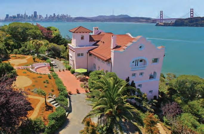 “The Pink House,” Belvedere’s most authentic example of the Mission Revival style, ca. 1912, with its curved parapet at the gable ends, quatrefoil windows & tile roof. Formal living room with wood-burning fireplace and adjacent arched terrace with unobstructed views of Mt. Tam, Golden Gate Bridge and the entire San Francisco skyline. Formal dining room with built-in cabinet & kitchen with access to the entry garden, the view-side terrace & au pair quarters. Upstairs level with four bedrooms, all of which open to the glass-walled view-side gallery. The master suite occupies the entire top floor, with fireplace, view-side terrace, large walk-in dressing area & lavish marble bath. Lower level has office, au pair studio, a separate one-bedroom apartment & the extraordinary ballroom with arched entry, wide staircase, and bar. Seven bedrooms, five and one half baths, and a wonderful step back in time… $8,900,000