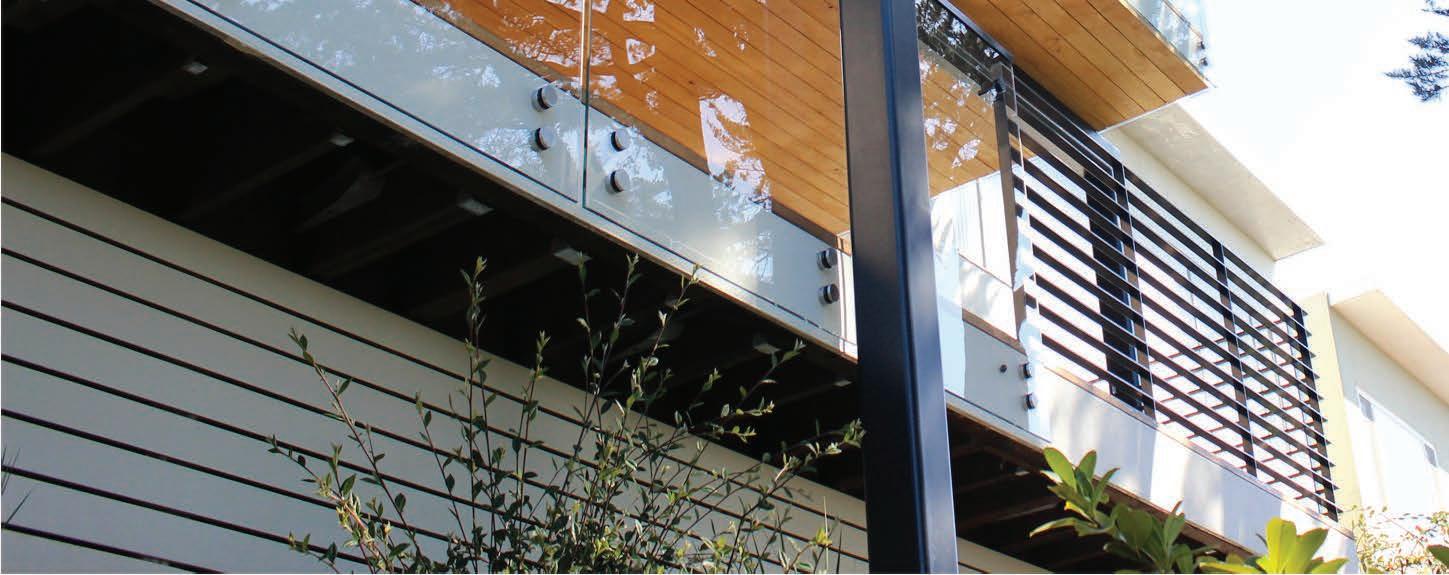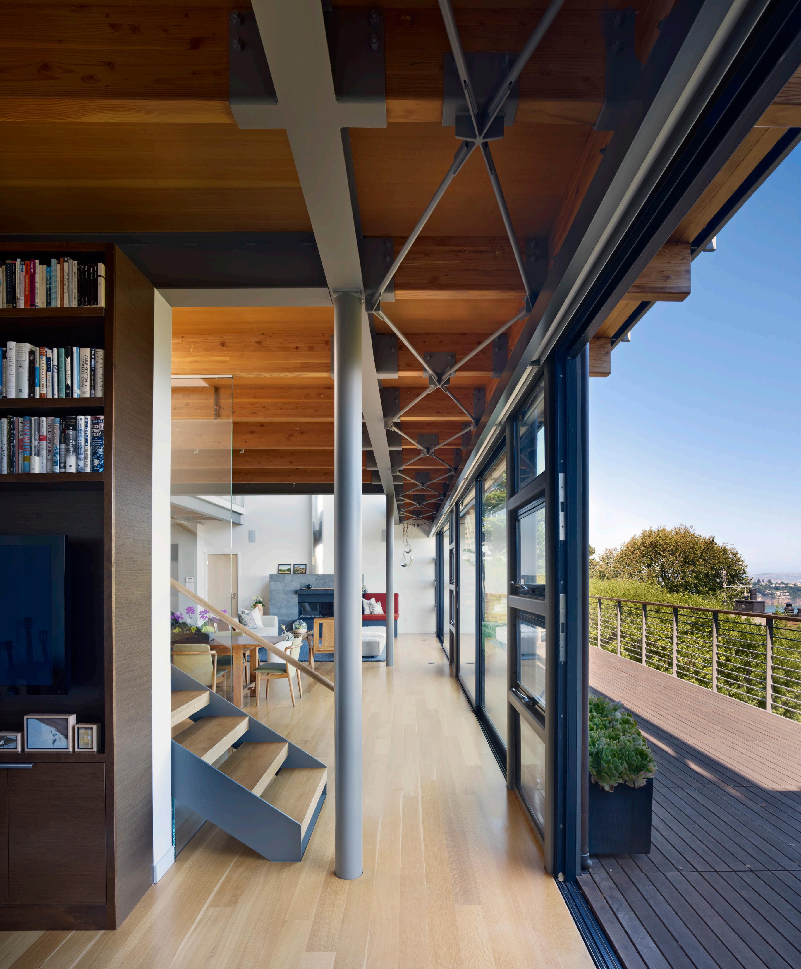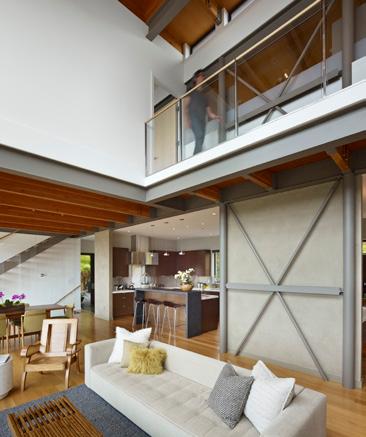 kitchen and the living room, whose French doors open onto a cantilevered deck that received new clear glass railings. Now, from several vantage points in the kitchen, “Julie can look across the living room at unobstructed views of Belvedere Cove,” the designer says.
