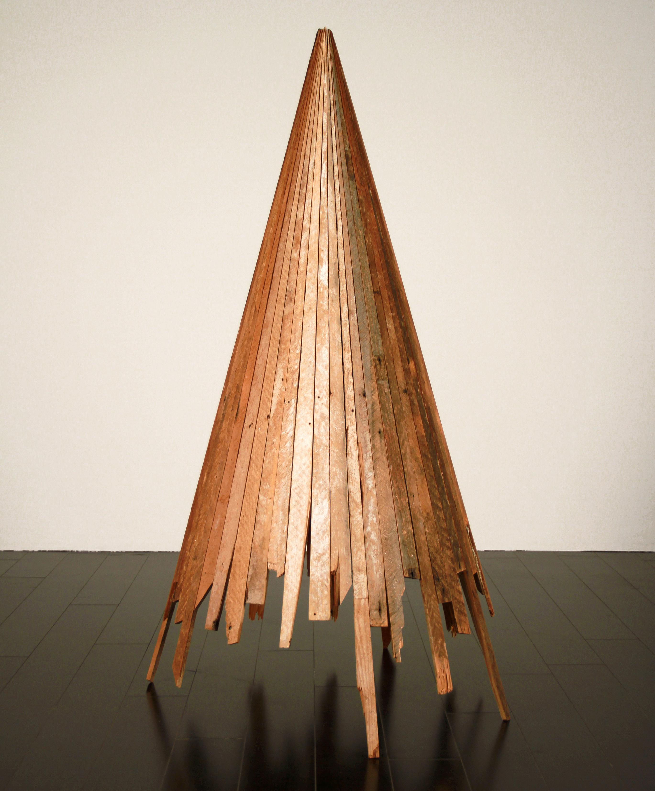 “The forms modeled in this way with light and dark wood are sculptural to look at but they are essentially flat,” Vogt says. “My work is sculpture as drawing.” Still working two-dimensionally, with mathematical precision, he lays together strips of lath from his curated collection to form two-dimensional cubes, rectangles, scaffolds and cones that have an Escher-esque quality and seem to jump forward off the surface or recede into it, depending on the angle the objects are viewed from.