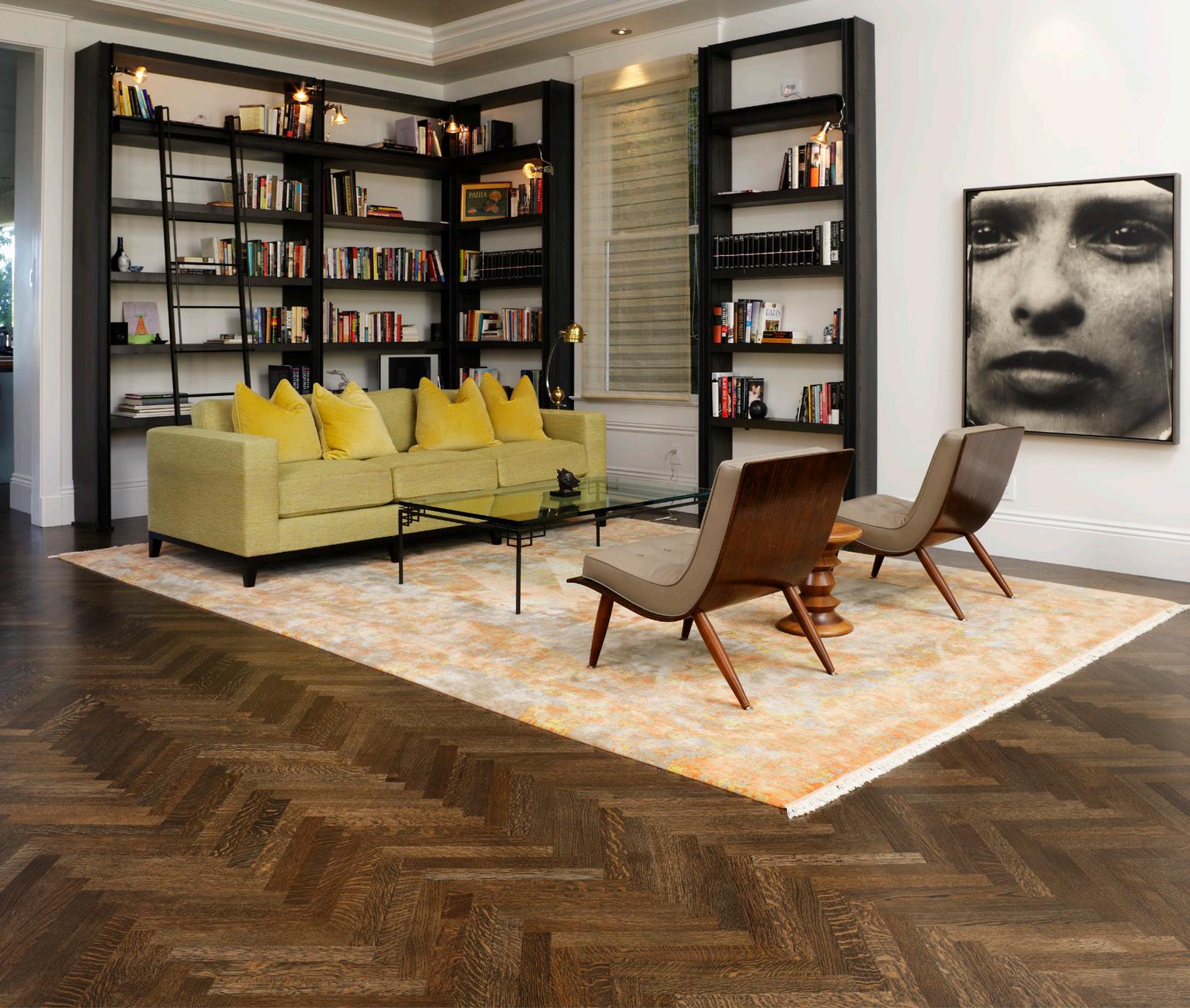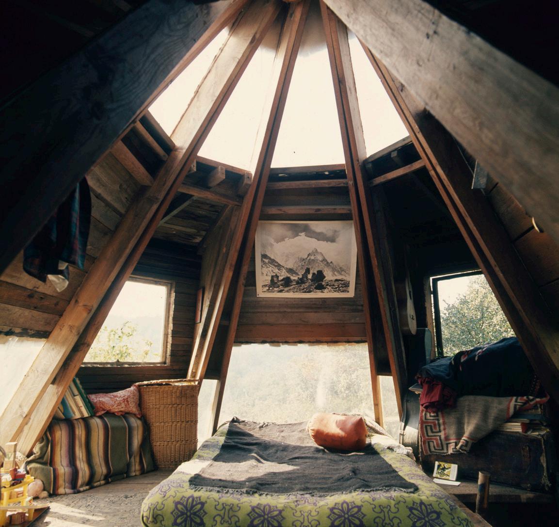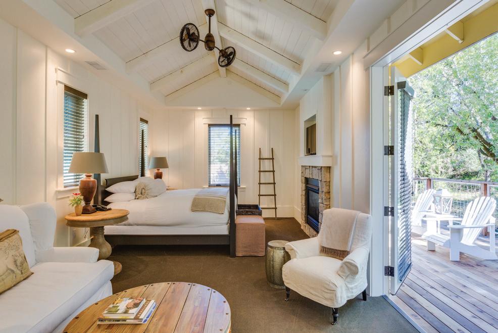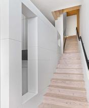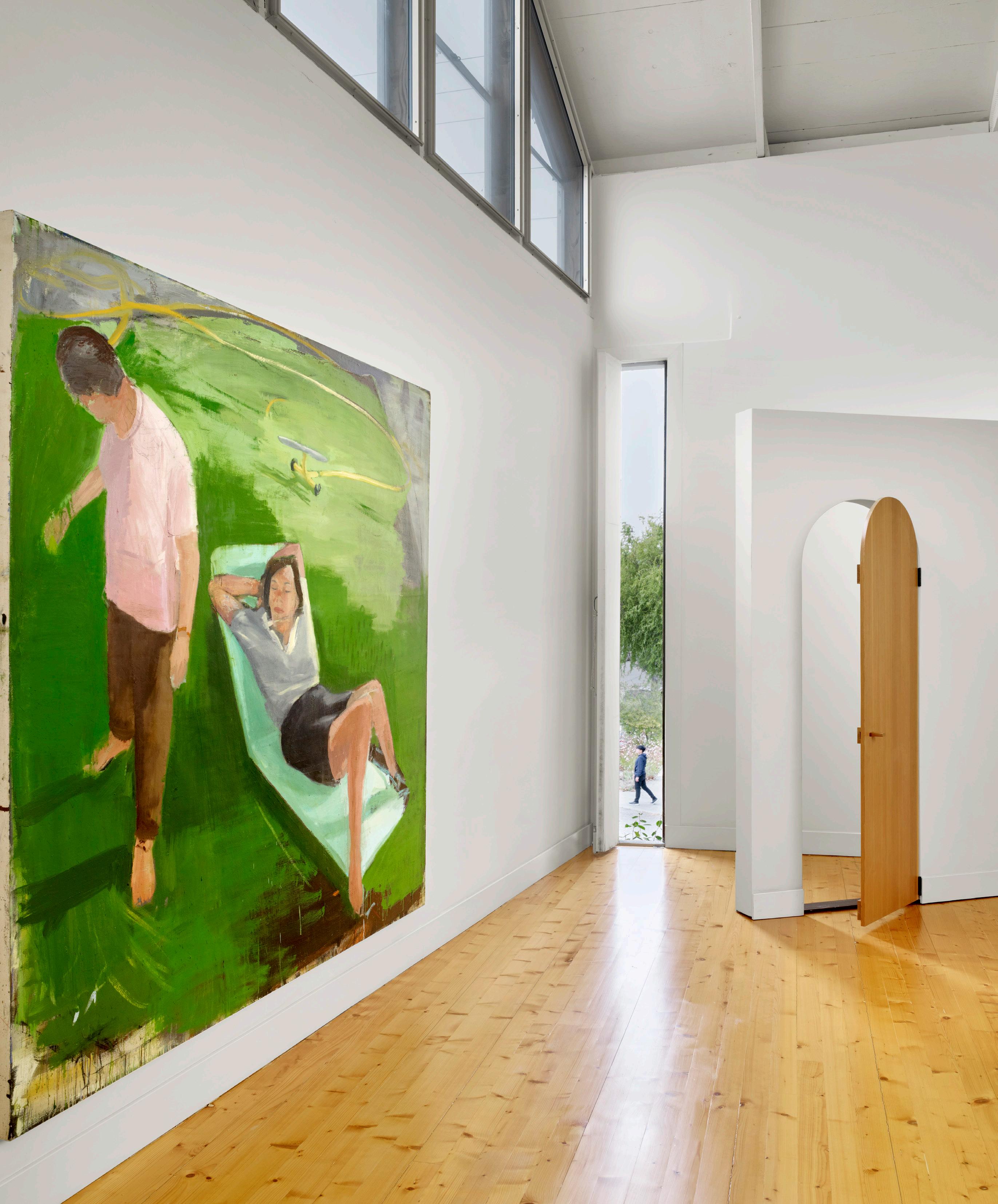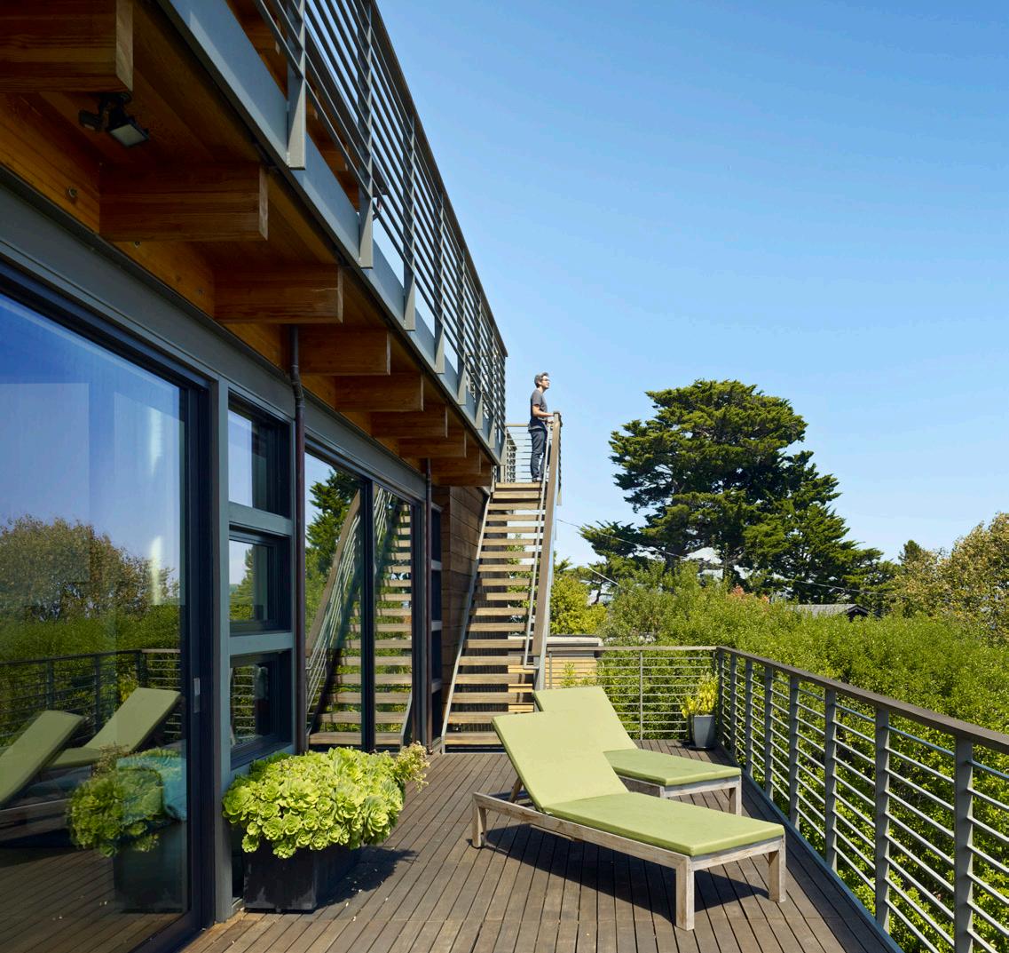 Outdoor seating, bench in grotto, Galanter & Jones, Helios Lounge, galanterandjones.com. Hot Tub, Diamond Spas, diamondspas.com. Fire pit, HPC, hpcfire.com. Lawn swings, Paola Lenti, paolalenti.it. ENTRY Lighting, pendant, Bocci, bocci.ca. SECOND FLOOR Untitled sculpture, 2016, under stair, Kirk Stoller, kirkstoller.com. MEDIA ROOM Mah Jong lounge seating, Roche Bobois, roche-bobois. com. Black Marquina marble countertop, New Marble Co., newmarbleco.com. Charcoal gray silk rug, ABC Carpet, abchome.com. MUSIC ROOM Green USM modular shelving, Haller, usm.com. Green Taurus alcove fabric, Maharam, maharam.com. Walls/paint, Snow Fall White #OC118, Benjamin Moore, benjamin moore.com. Flooring, fir, First Last Always, first-last-always.com. MASTER BEDROOM