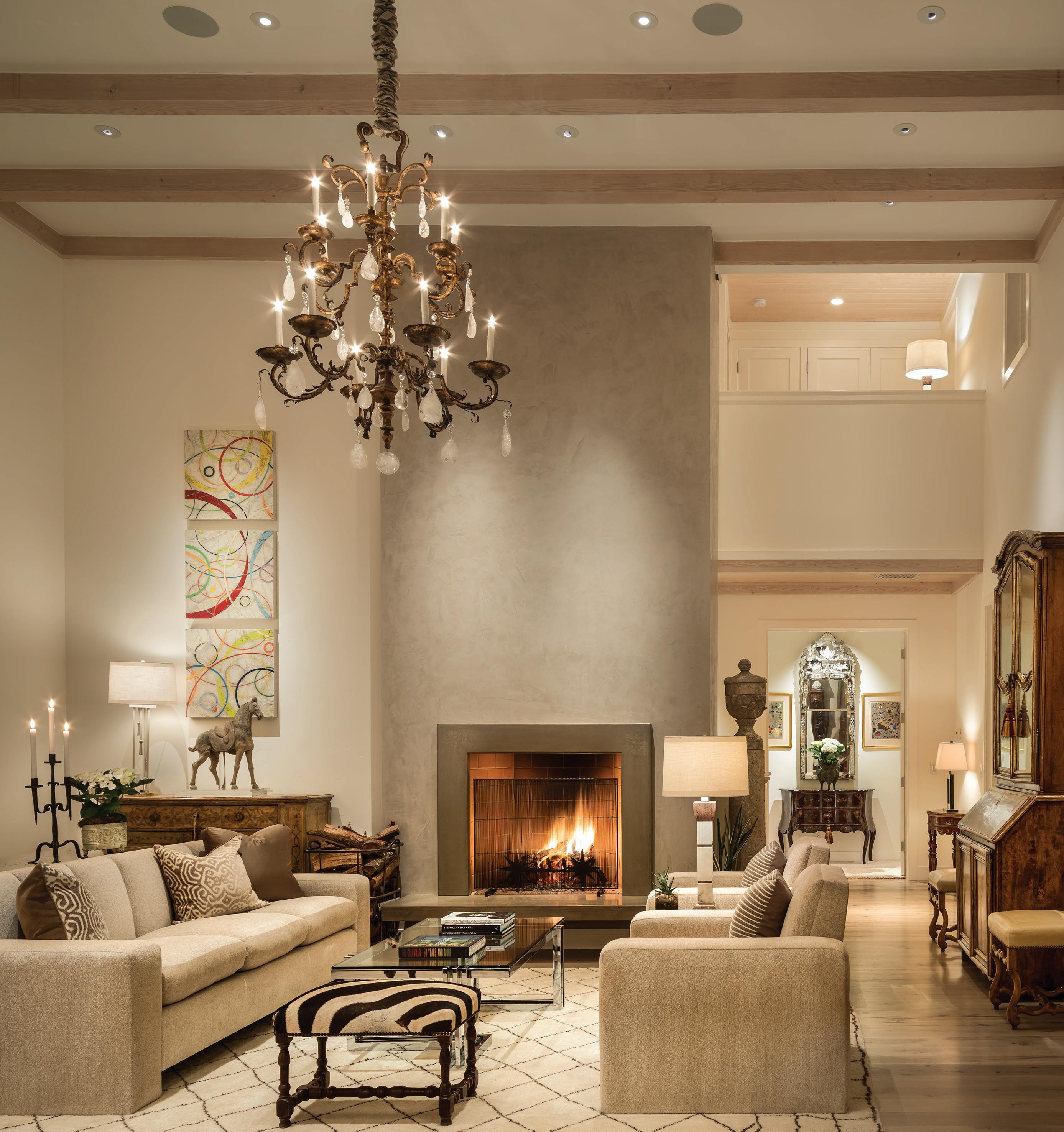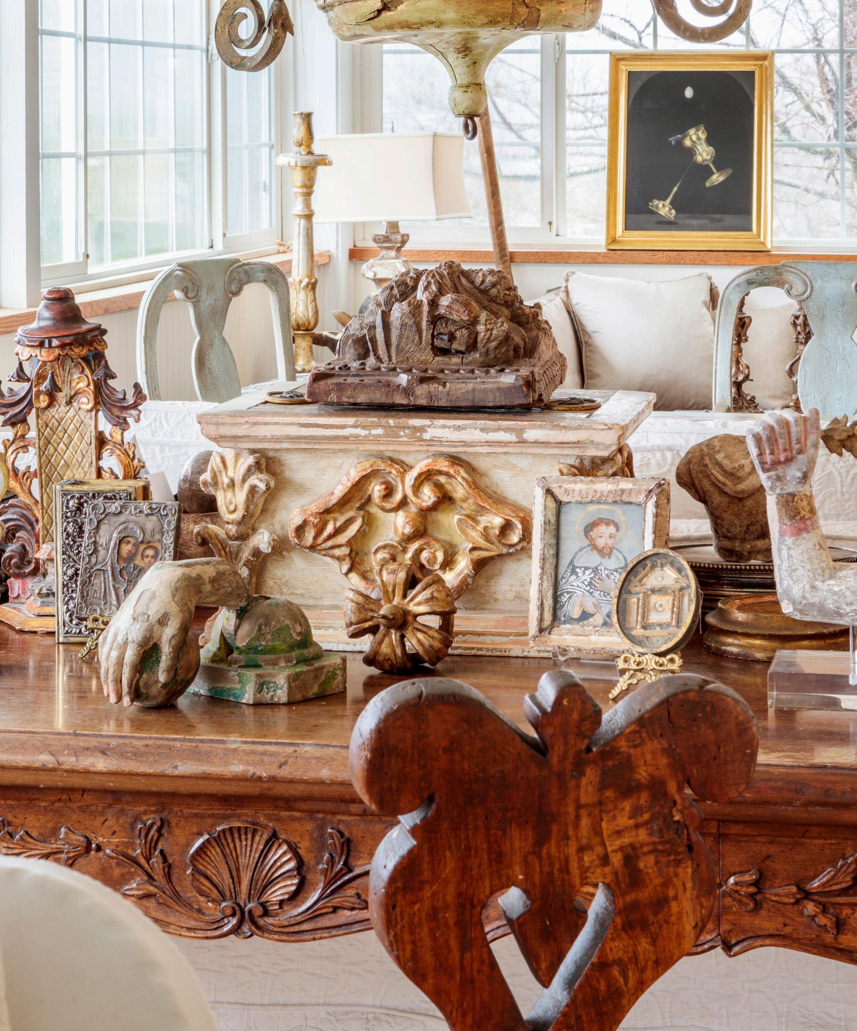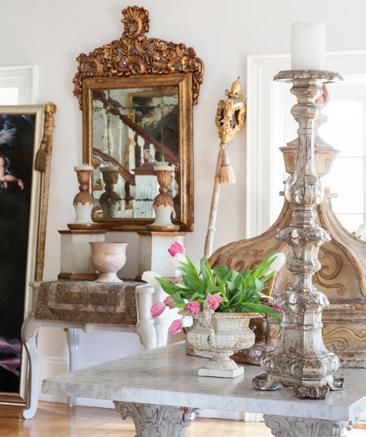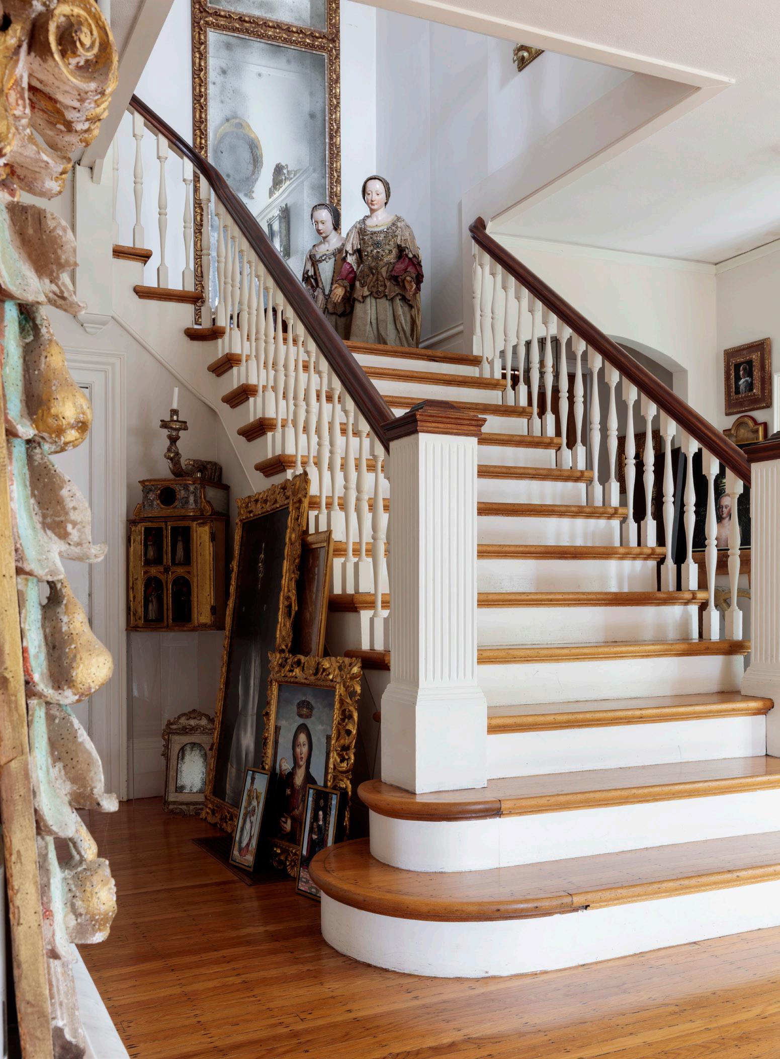 FRONT HALL/STAIRCASE Papier-mâché kneeling figures, Italian, circa 1600. Stacked paintings, various, by owner/artist Linda Cosgrove, cosgrovefineart.com. MIRROR/ CANDLESTICK 18th-century Mexican cupola. Gilt, wood and vellum centerpiece. Early Michoacan terra-cotta urn. 18th-century silverleaf Italian prickets. 17th-century Bolognese scepter. LIVING ROOM
