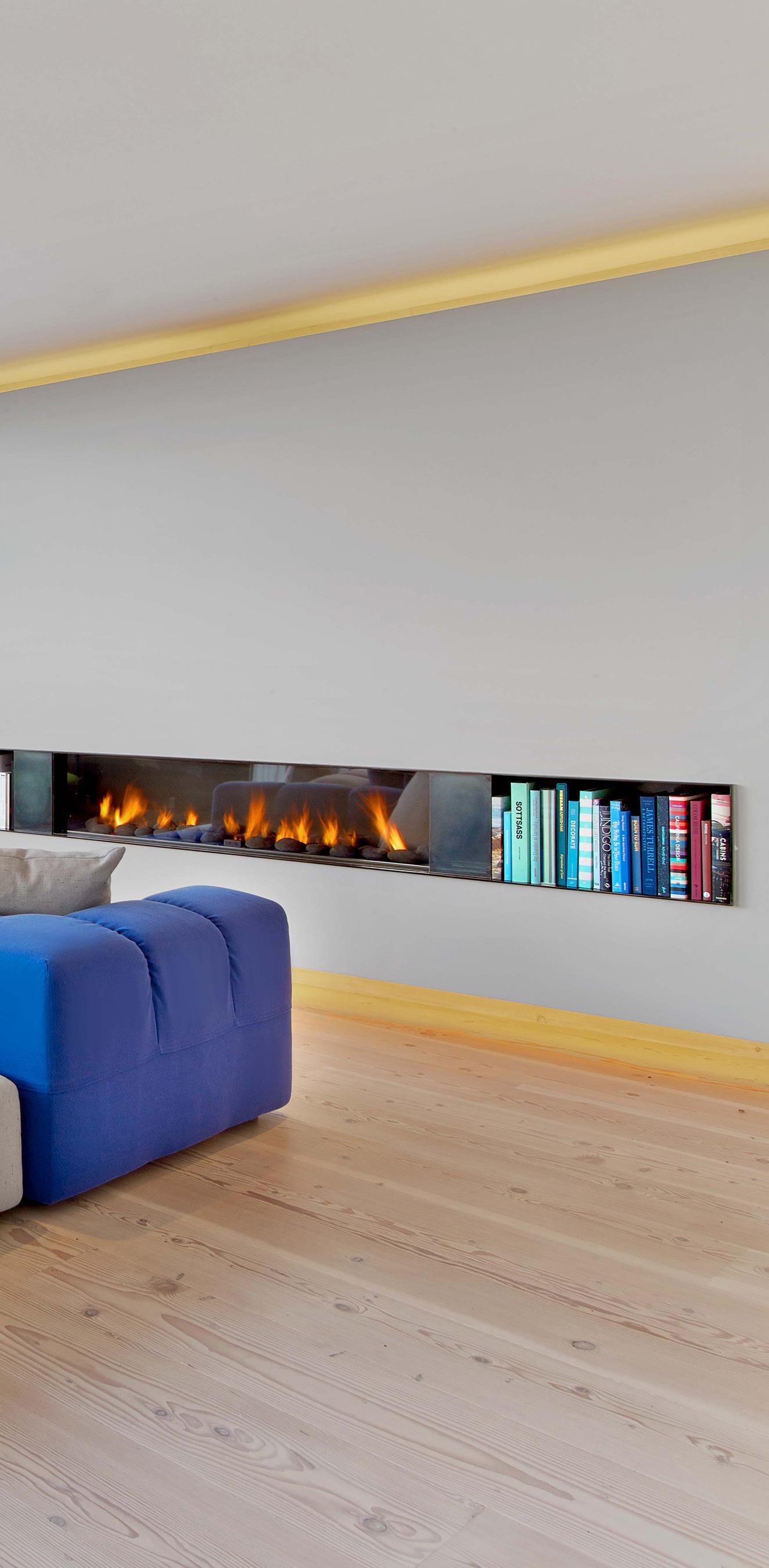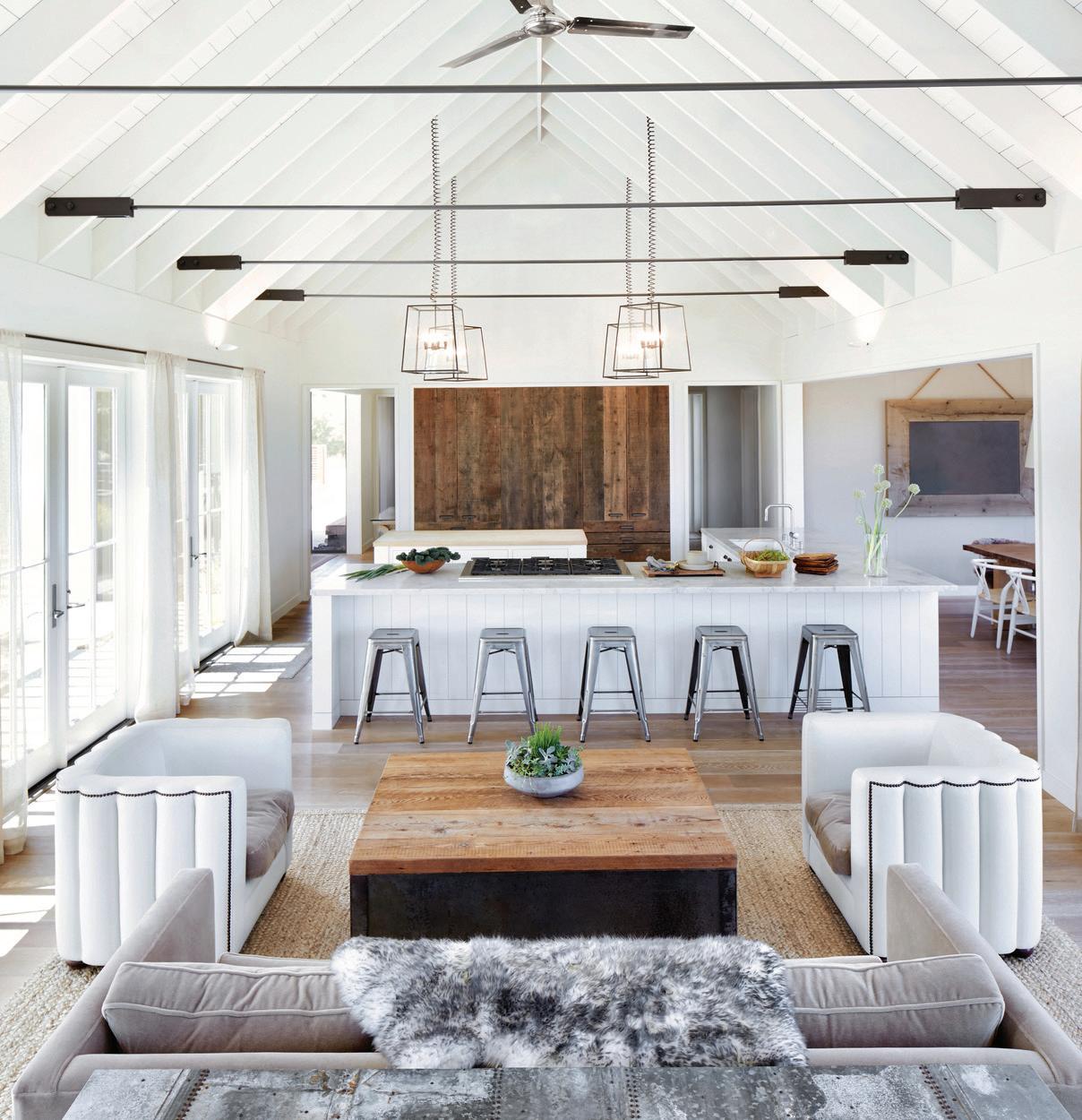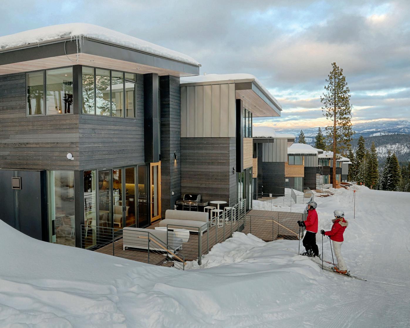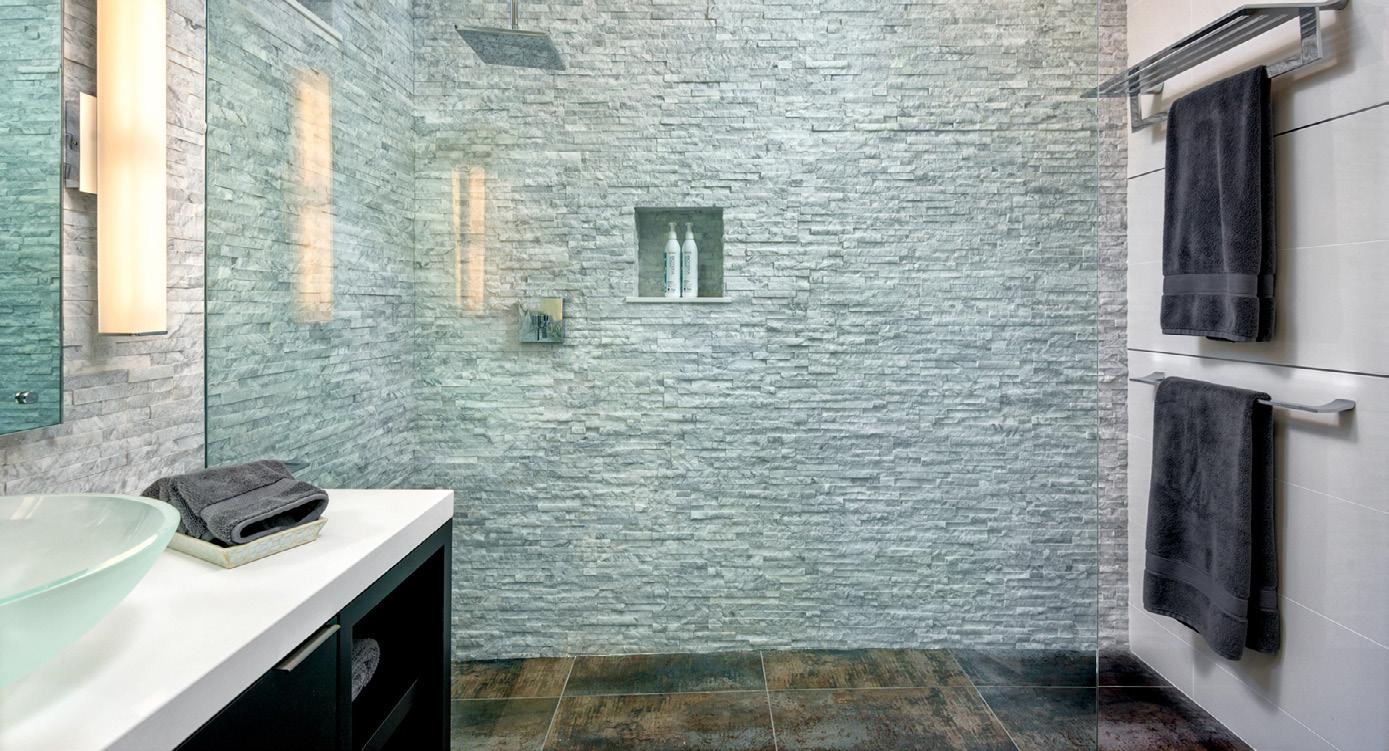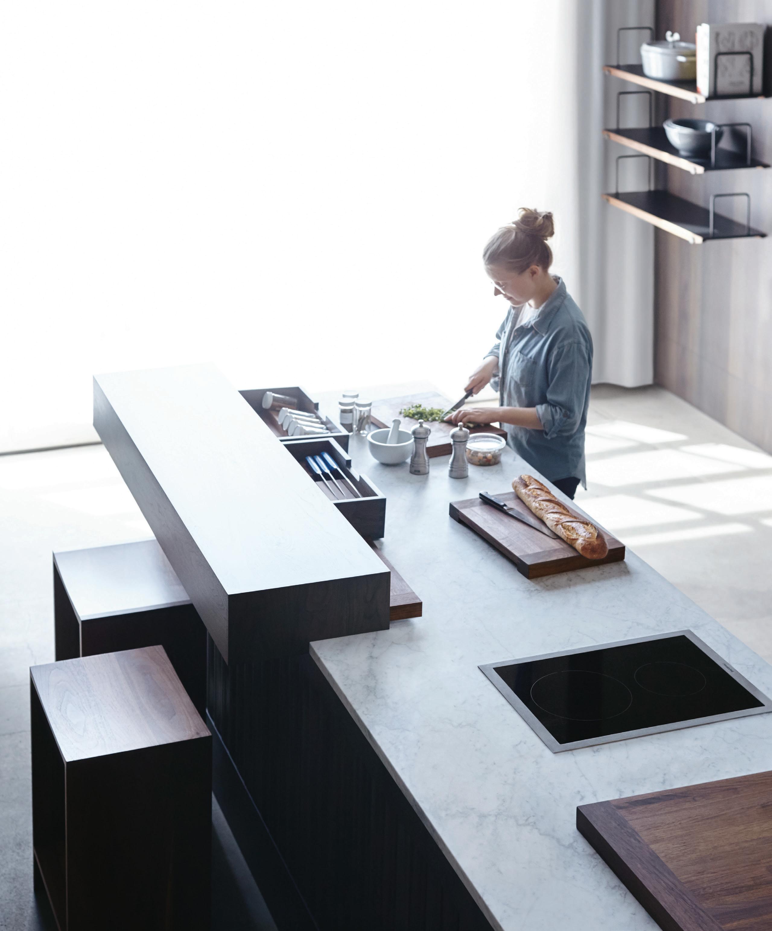 BATHROOM Plumbing fixtures, Sen Series, finish black, Agape, agapedesign.it. Tub, Sabbi Freestanding, Boffi, boffi.com. Rain shower, Balance Modules, Dornbracht, dornbracht. com. Sink, Evo-E2 Series, Agape. Countertop/ flooring, Calcatta Oro classic marble, New Marble Co. LIVING ROOM Couch, Tuffy Time, B&B Italia, bebitalia.com. Fireplace, 150 Series, Ortal, ortalheat.com. Fireplace surround, blackened steel, custom, standard sheet metal. Lighting, tape in downlighting, Lucifer, luciferlighting.com. Sliding door, Norwood series, Fleetwood. KITCHEN/Dining Island