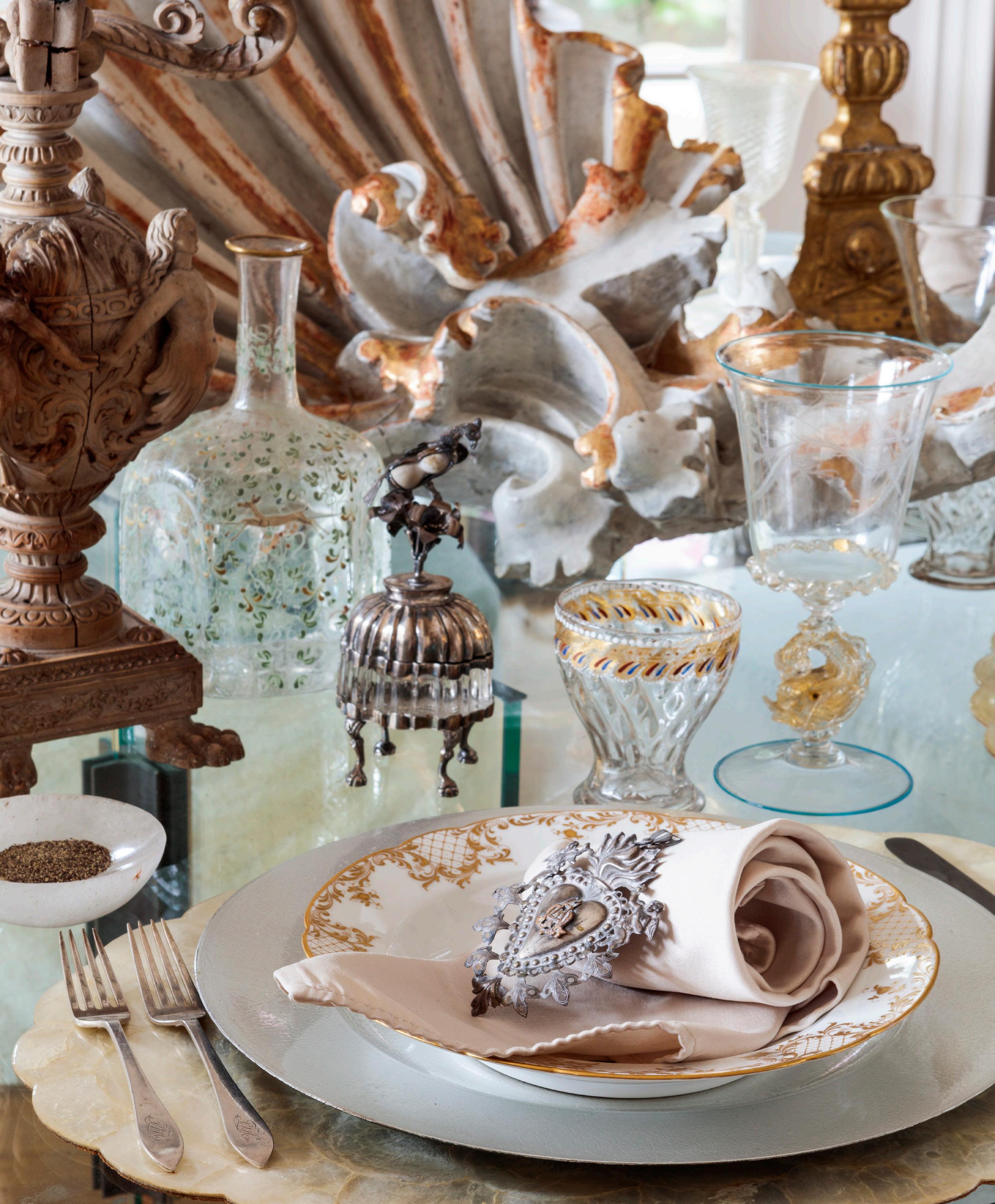 TABLE SETTING Rock crystal pepper dish from the Roger Thomas Collection. Silver votive. 18th-century wooden candelabra.