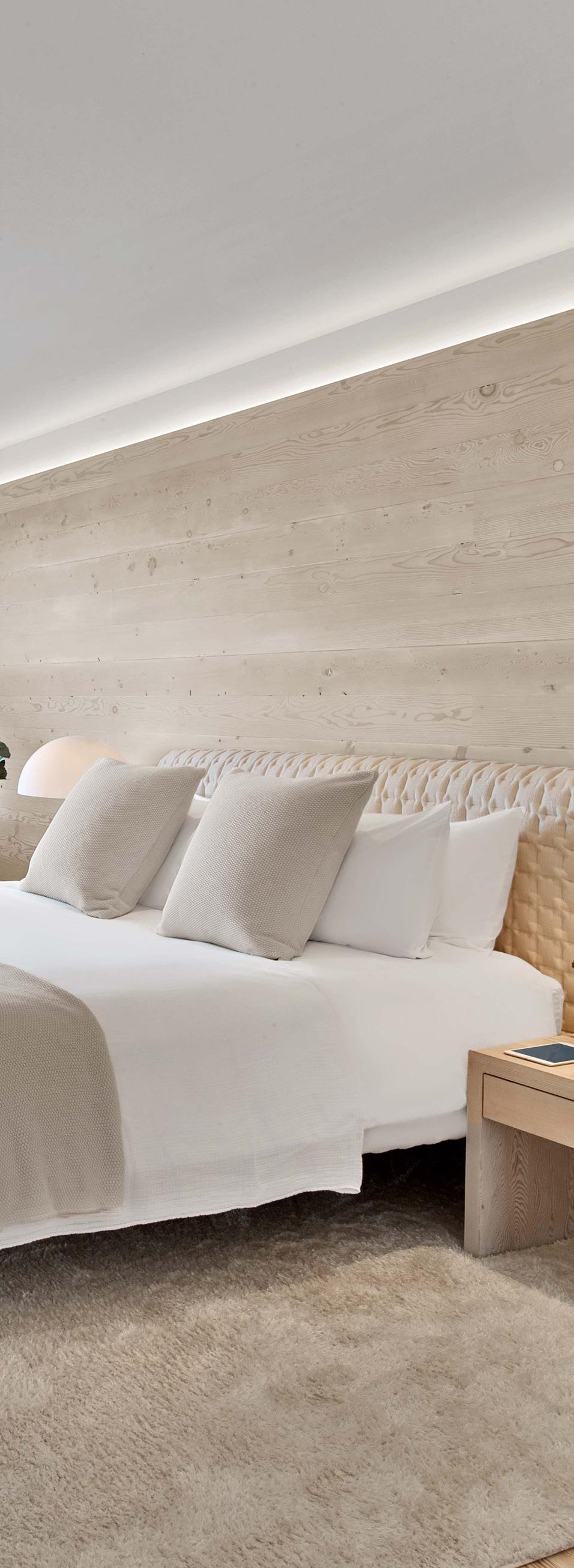 Reclaimed bleached plain sliced Douglas fir wood wall, First Last Always. Bed, Ruche, Ligne Roset, ligne-roset.com. MASTER