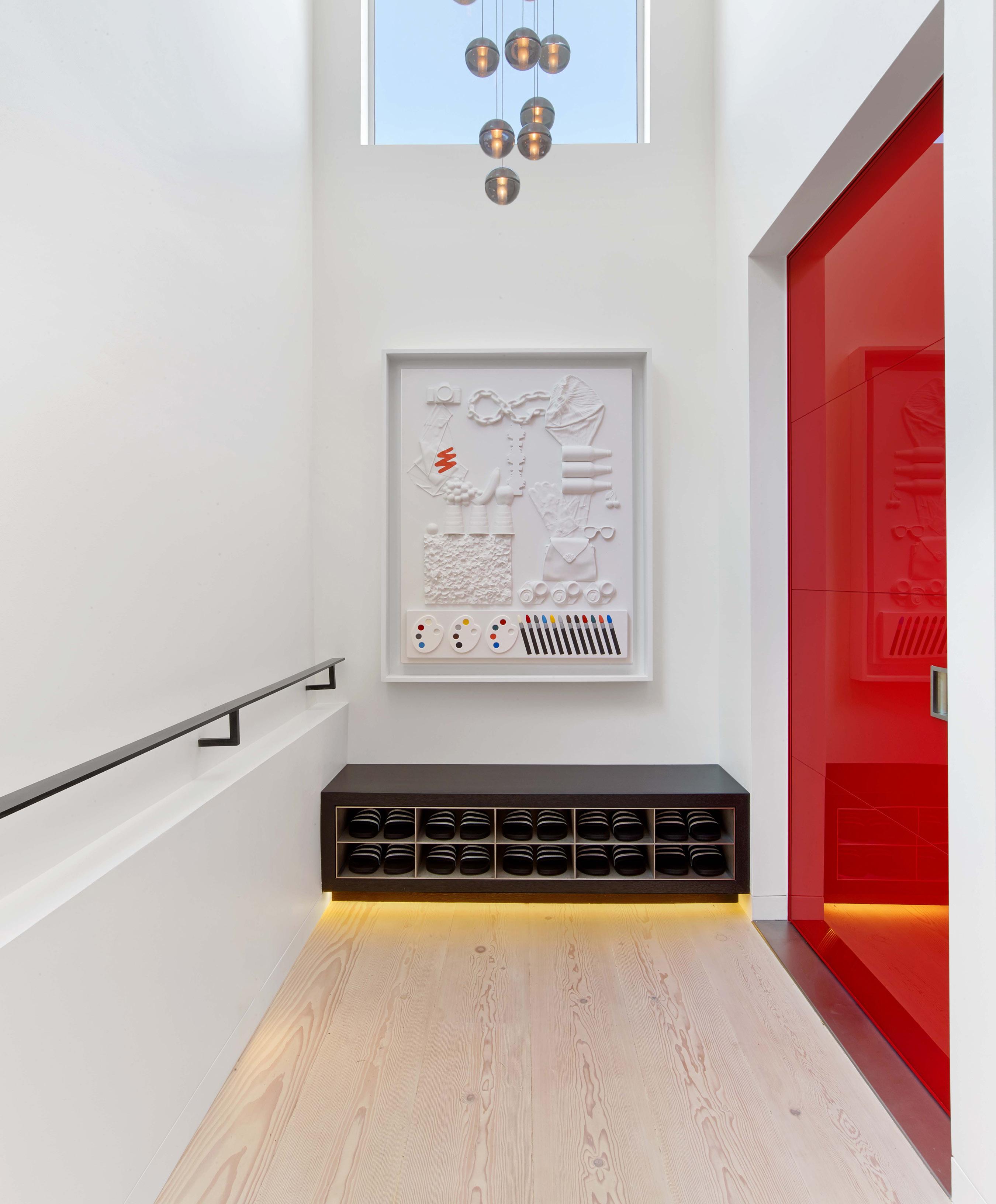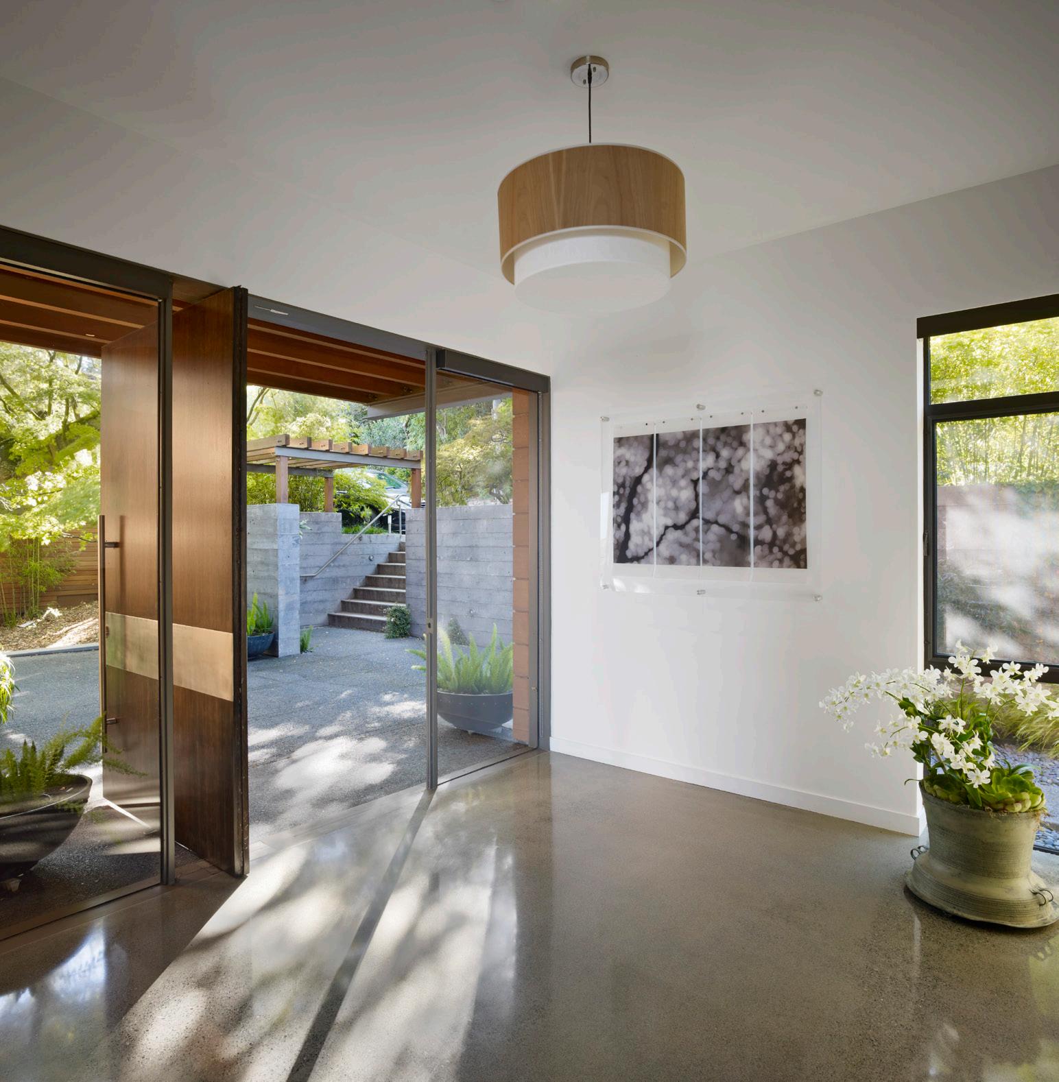 EXTERIOR Entry door, custom-made pivot door, painted red glass, Fenestration Concepts, fenestrationconcepts.com. Siding, Delta’s Burn & Brush, Shou-Sugi Ban, Delta Millworks, deltamillworks.com. Windows, Fleetwood, fleetwoodusa.net. LANDSCAPING