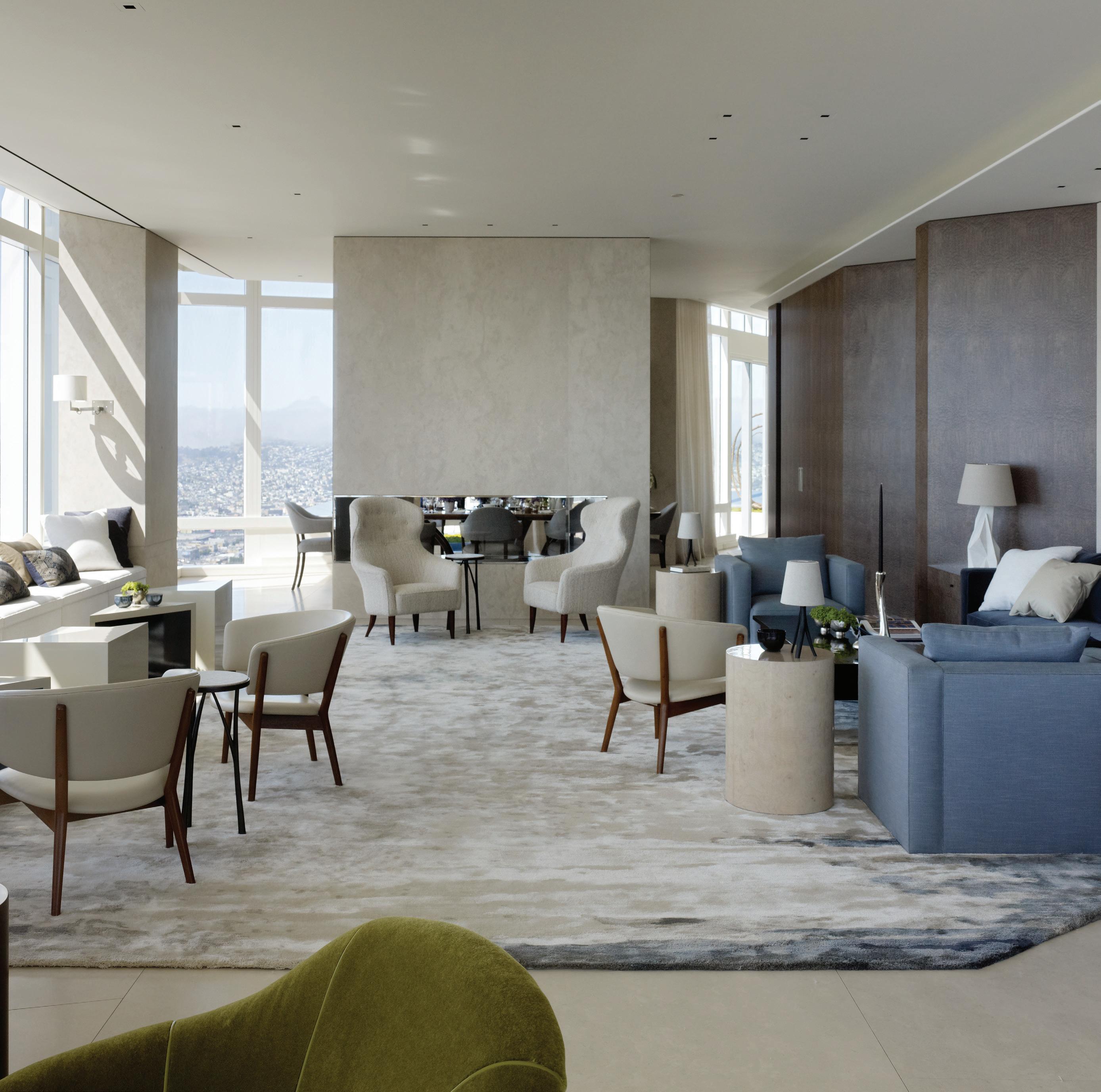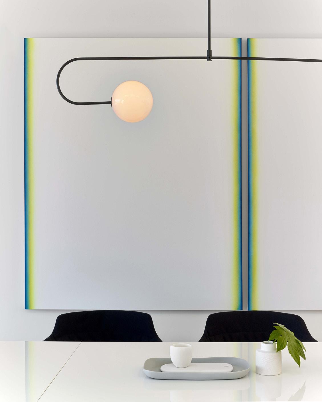 Cabinetry, Spiral III Design. Countertops, Honed Calacatta Oro Franchi Marble, New Marble Co. Lighting, Mobile Chandelier 8, Michael Anastassiades, michaelanastassiades. com. Dining ceiling, polished stainless steel, standard sheet metal, standardsheetmetal sf.com. Appliances (dishwasher, refrigerator, cooktop) Gaggenau, gaggenau.com. Artwork, paintings, Joey Piziali, joeypiziali.com. FRONT