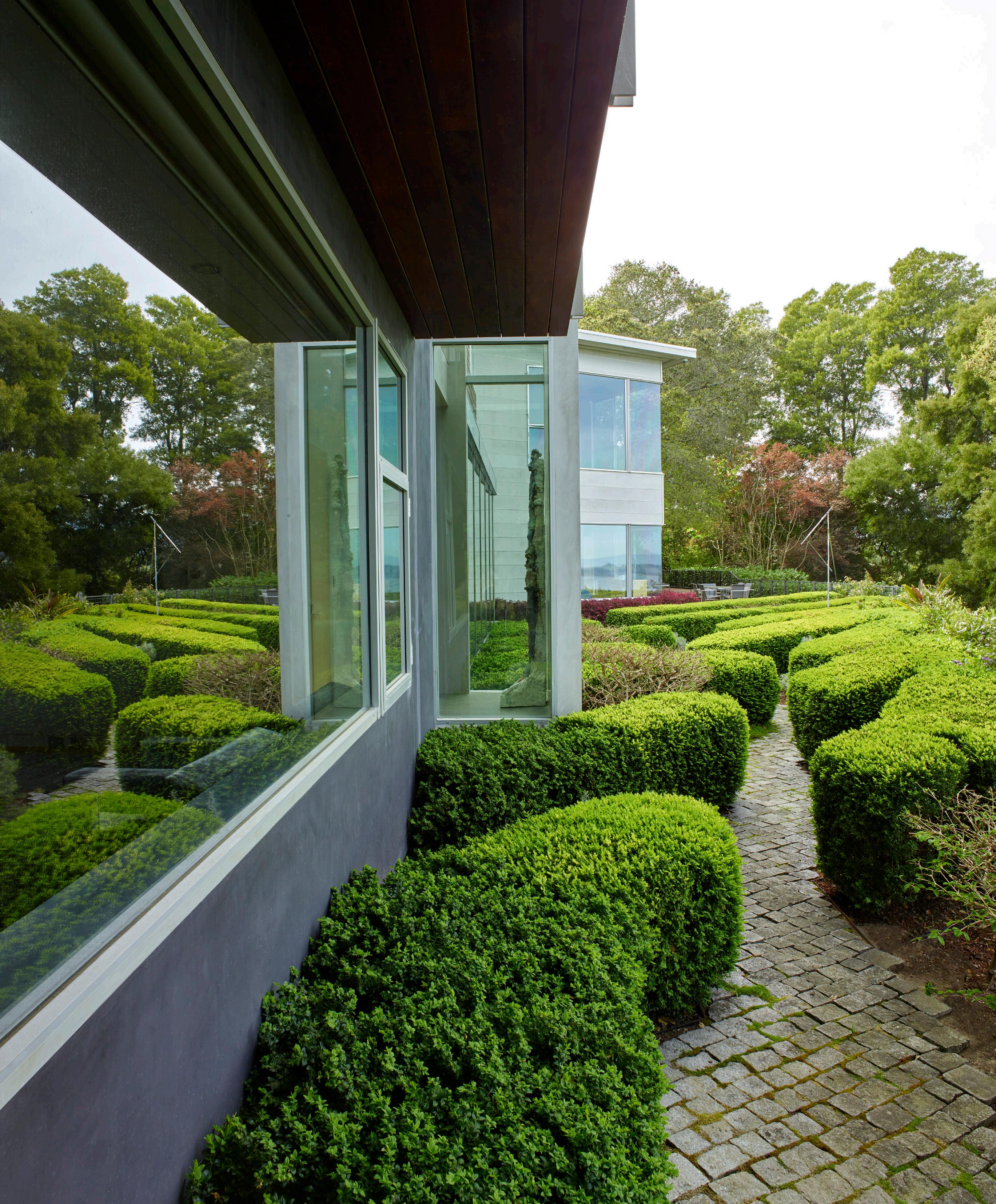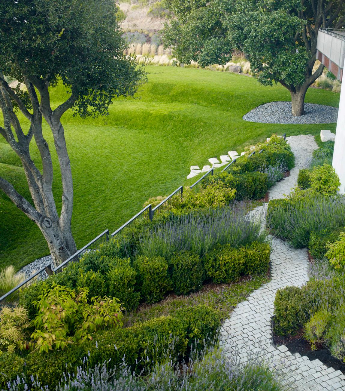 Clipped hedges add a kind of formality to a meandering paved pathway, as well as spots for displaying art alongside the house. Mounded retaining hills on the edge of the garden are actually play structures, including one with an embedded trampoline. Old curbstones laid as steps are an informal amphitheater between the house and the grassy areas surrounding old oak trees.