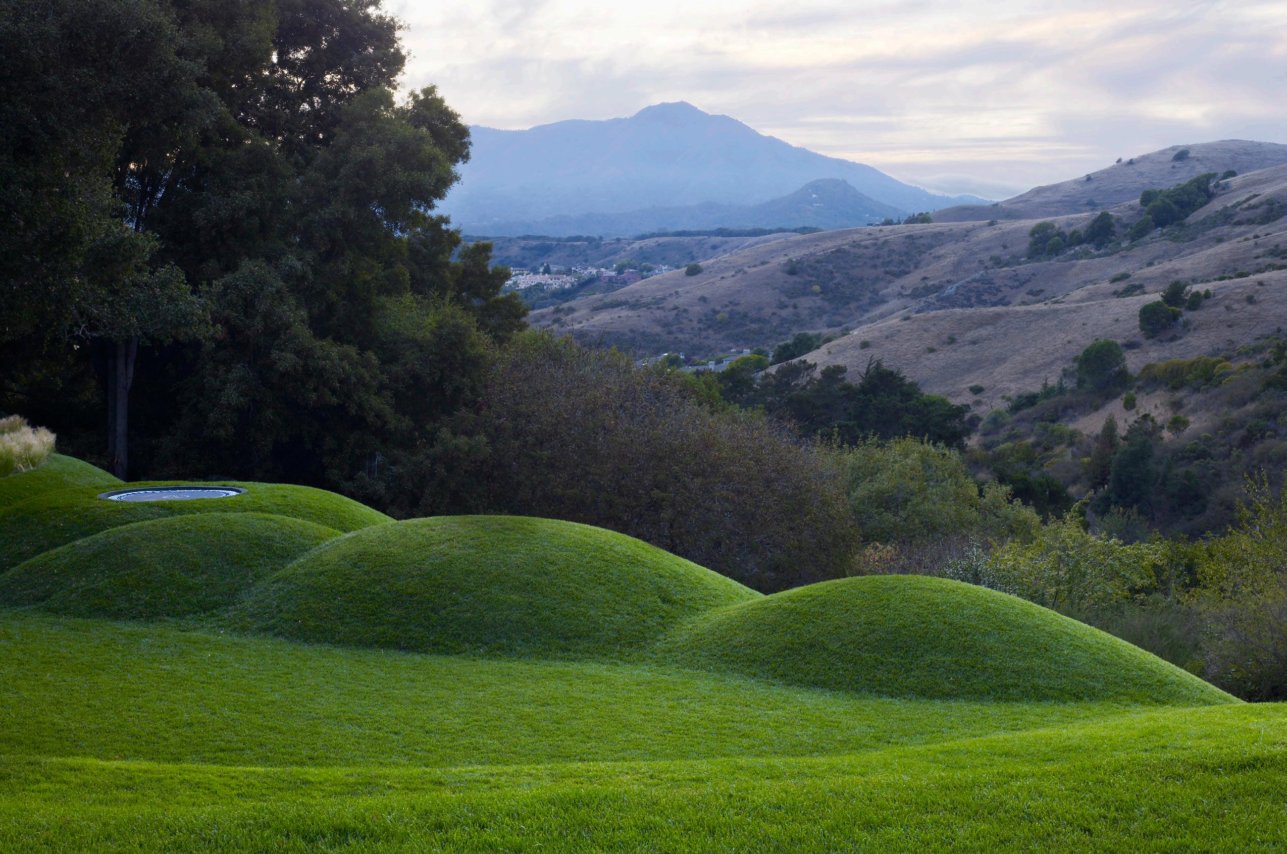 While the long views down each of the pathways reflect French perspectival techniques, a maze of hedges of lavenders and salvia that snakes back and forth to form enclosures for displaying sculptures, just west of the amphitheater, was inspired by English knot gardens. The designers also borrowed from serene Japanese gardens for areas that “look inward, toward the ground, and land art by artists Michal Heizer and James Turrell to make those playful forms out of the earth,” Wyllie says.