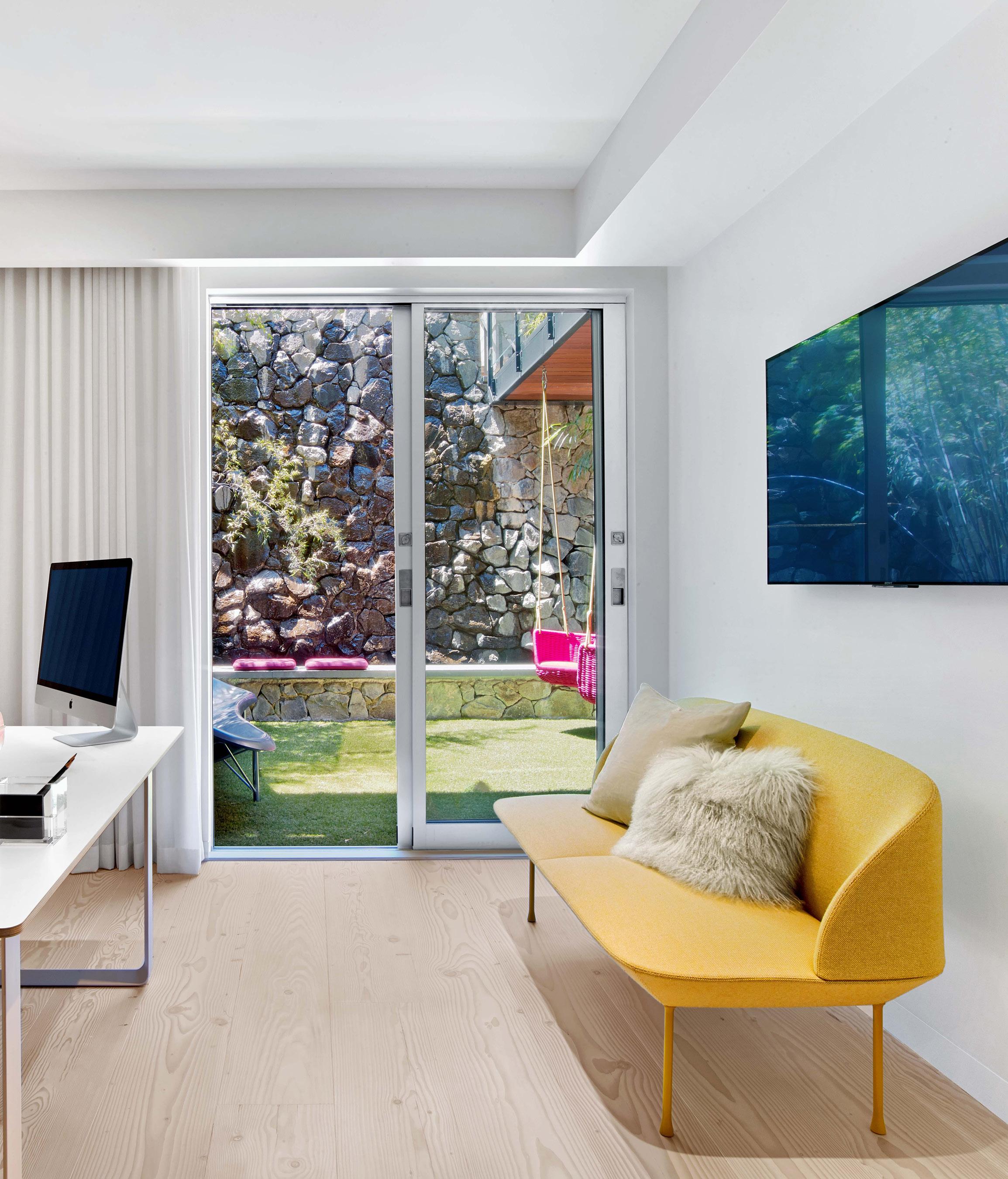 FAMILY ROOM Sofa, custom. Surfer painting, David Venezky. OFFICE Desk chair with perforations, IKEA, ikea.com. MASTER BATH Tub, Wetstyle, wetstyle.ca. MASTER