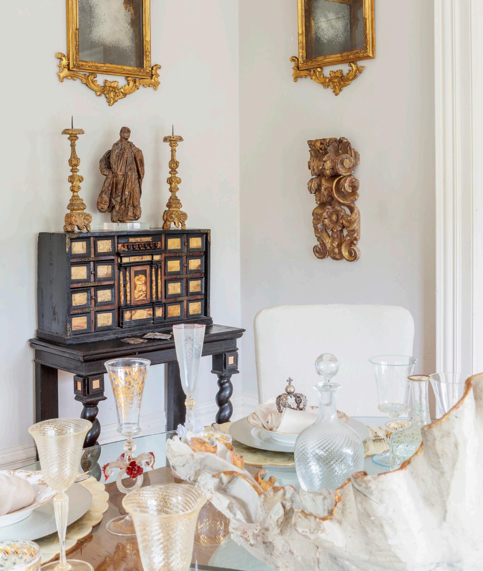 DINING ROOM CHEST 18th-century Spanish Vargueno cabinet. Pair of 18th-century Italian mirrors. 16th-century Madonna. 18th-century Italian prickets. ART CLOSE-UP Goblet painting, oil on copper by Linda Cosgrove. 19th-century continental plaster cast medallions on 15th-century leather-bound breviary.