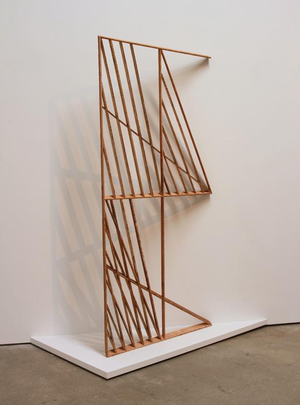 With rampant gentrification that has made it impossible for artists to find affordable housing or studio space in the city, Vogt turned his concern into an artistic opportunity. But the material he found also sparked a body of work that ranges from two-dimensional “drawings” and “sketches,” all made of strips of about one-inch-wide lath grouped together, to three-dimensional sculptures and site-specific installations.