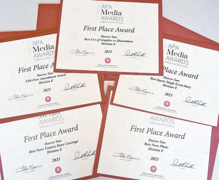 In addition to the seven first-place awards, the Hoover Sun also had one second-place finish and six third-place awards in the 2023 competition, which involved work published in 2022. The Hoover Sun competes in the Alabama Press Association’s Division E, which includes associate member newspapers and free circulation products.