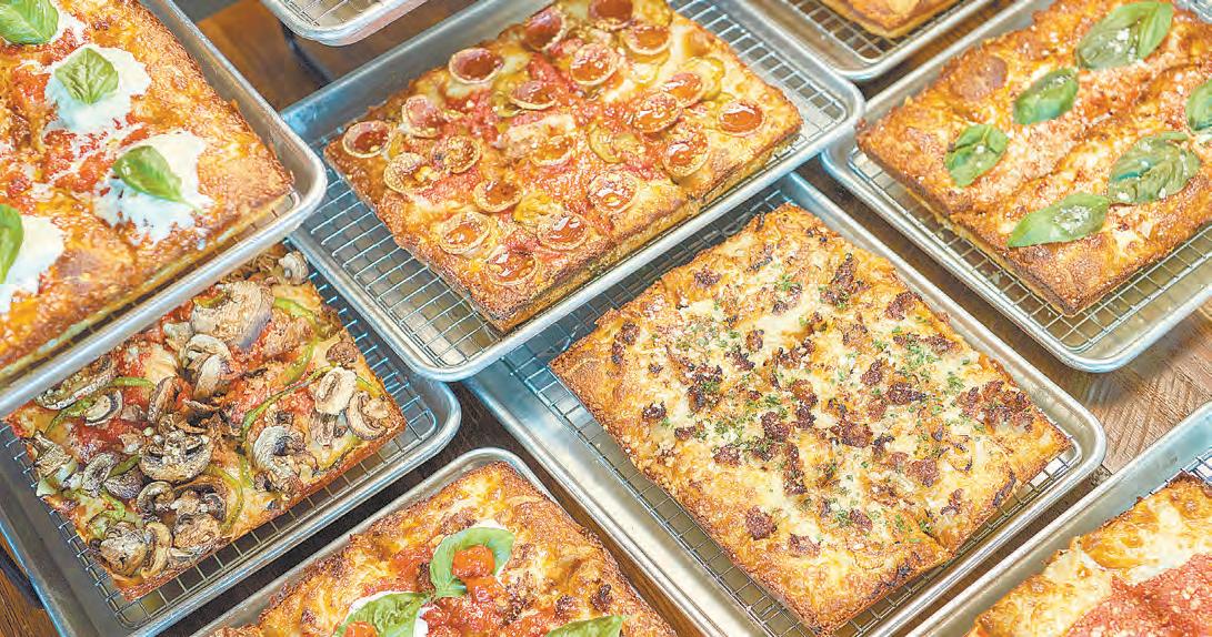 and unique toppings and the signature Detroitstyle pizza marked by its square shape, crispy bottom, fluffy dough, cheesy "frico" crust and signature sauce stripes set Emmy Squared apart.