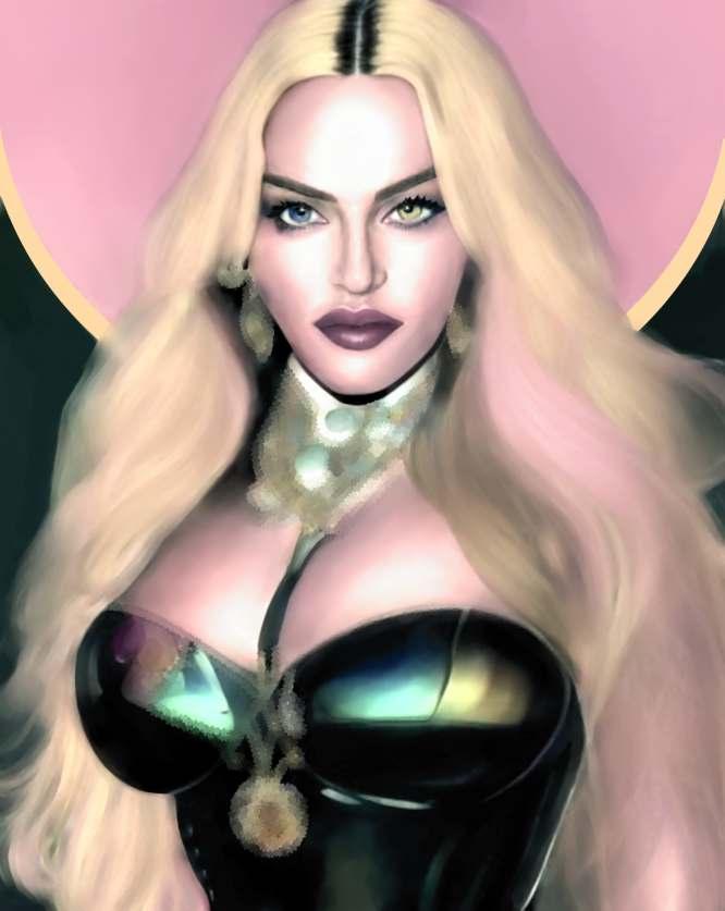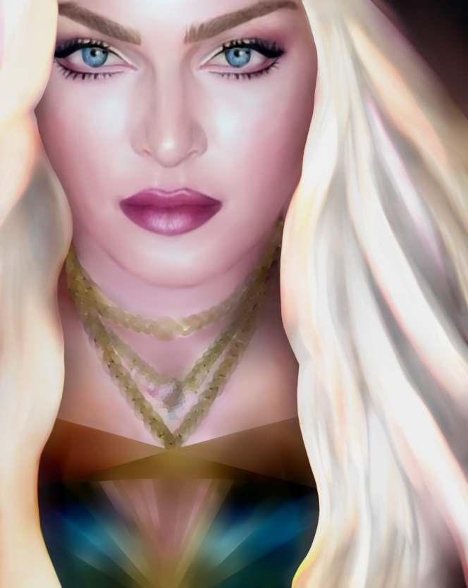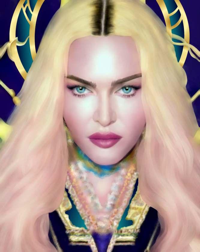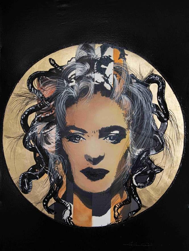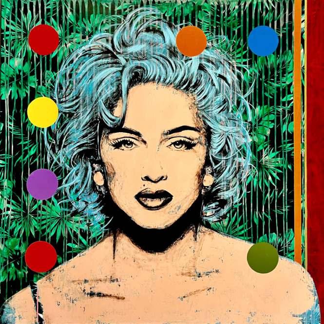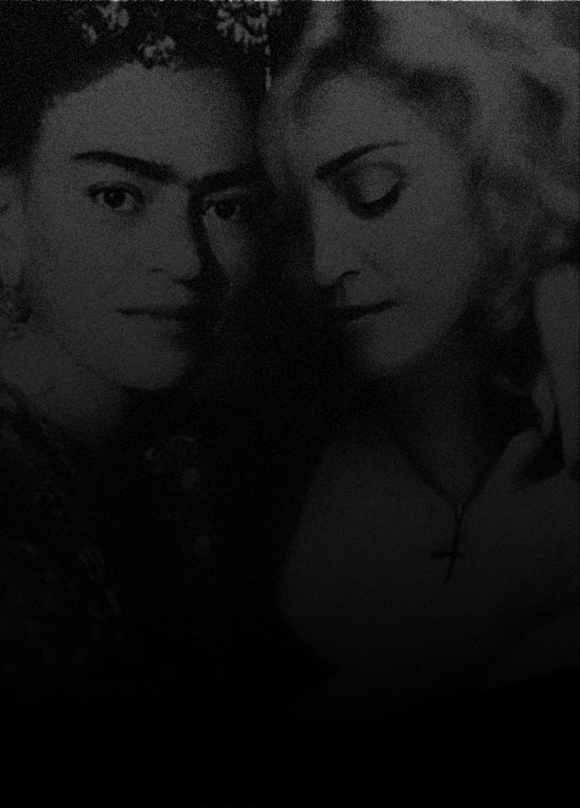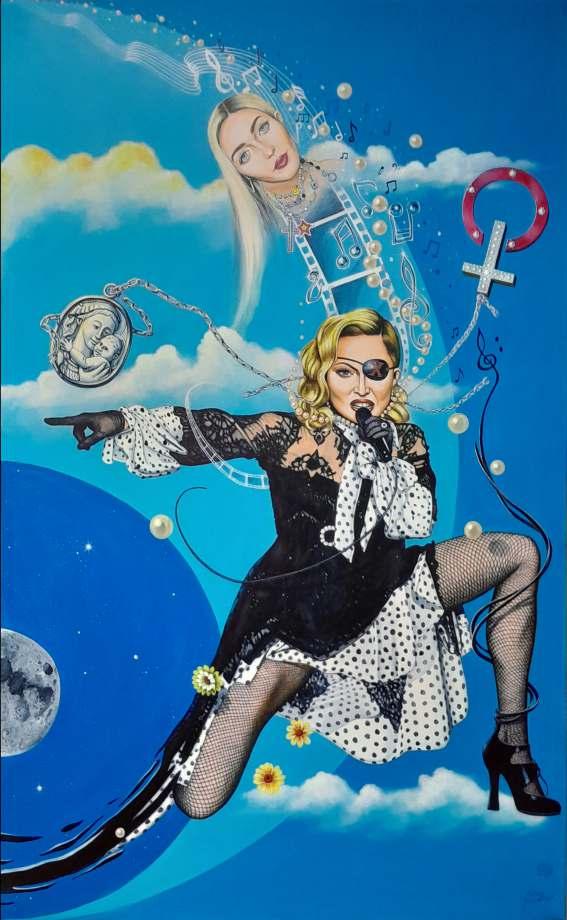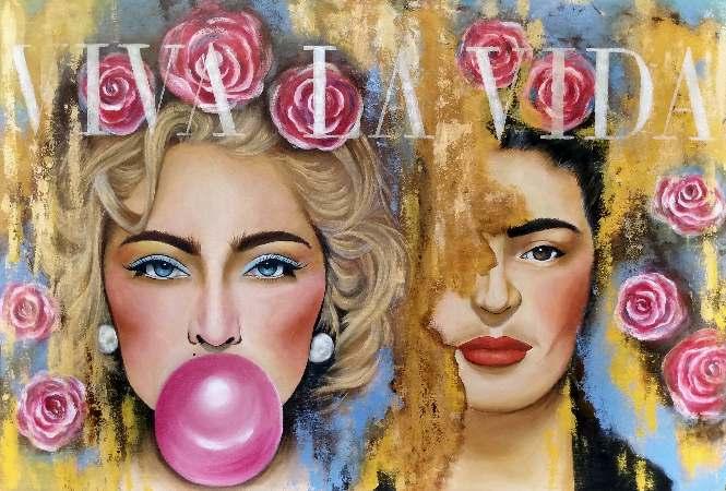 Esta obra mostra essencialmente os principais traços do seu rosto cuidado e perfeito. As coresquedesteseirradiam,sãocomoraiosdeluzdeumaauraprópriadoestrelato. Os apontamentos de crucifixos são a imagem dos seus marcantes acessórios. As flores são uma homenagem a esta artista, e são também, as flores que caracterizam a imagem de Frida Kahlo, estas duas mulheres que embora vivendo em épocas diferentes, se distinguiram pelo seutalento,arte,coragemeforça.