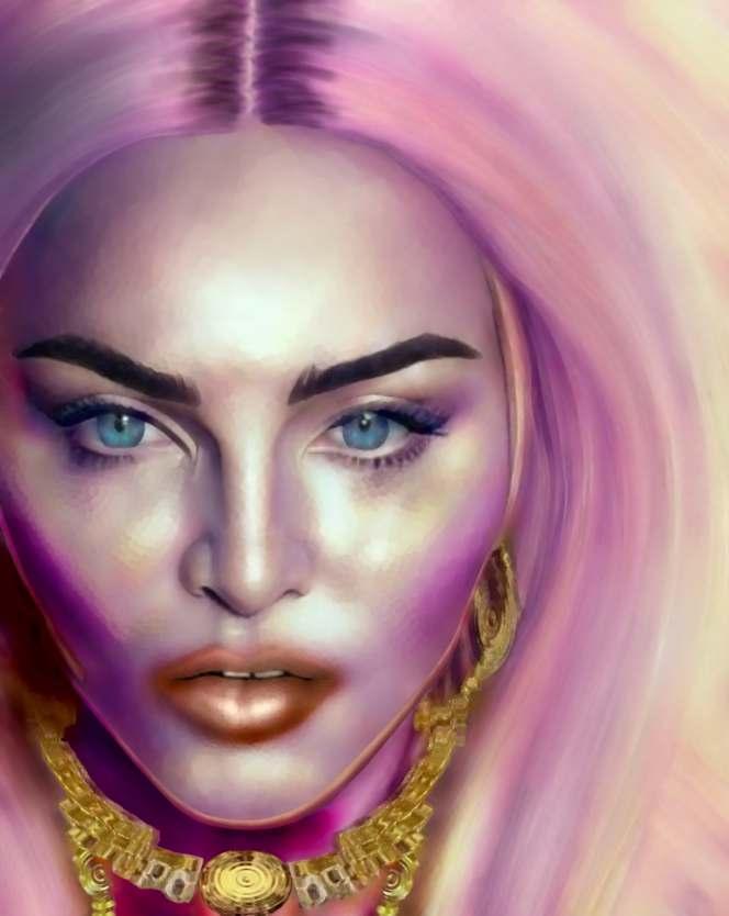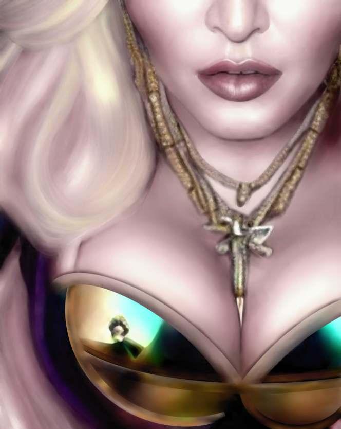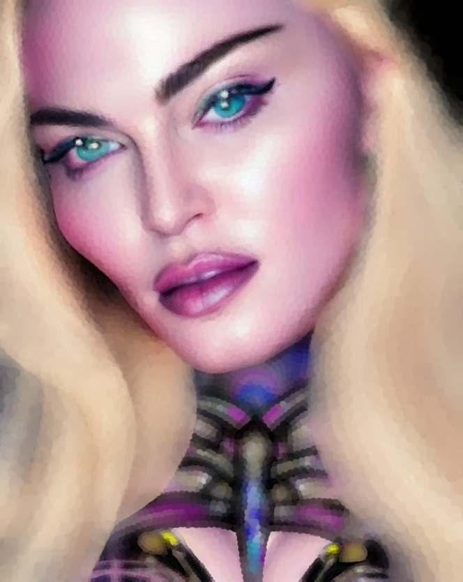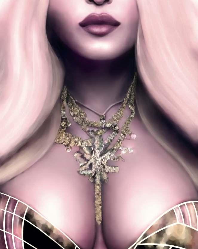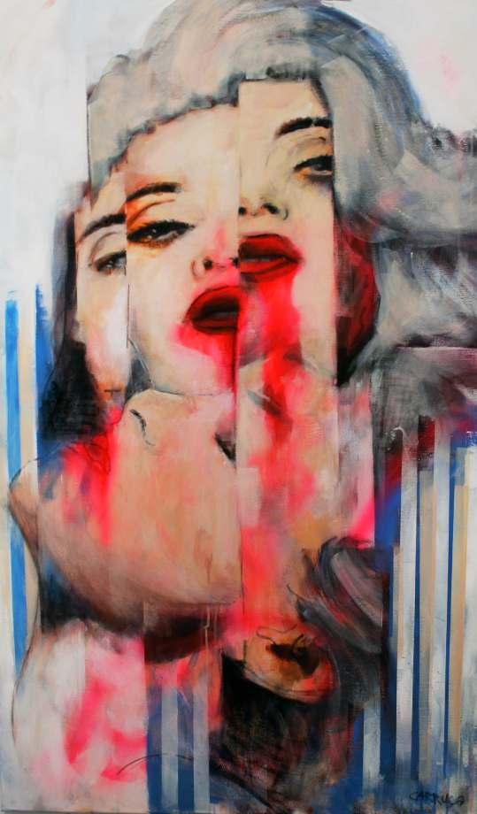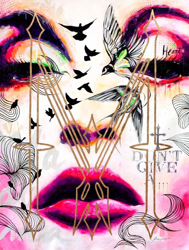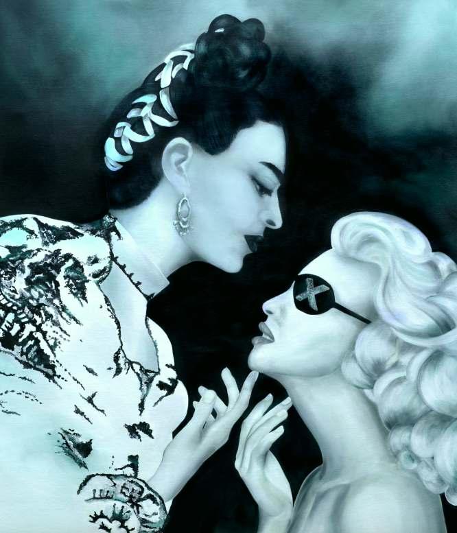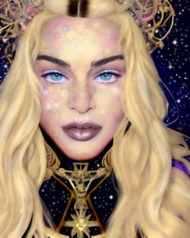 Esta obra mostra essencialmente os principais traços do seu rosto cuidado e perfeito. As coresquedesteseirradiam,sãocomoraiosdeluzdeumaauraprópriadoestrelato. Os apontamentos de crucifixos são a imagem dos seus marcantes acessórios. As flores são uma homenagem a esta artista, e são também, as flores que caracterizam a imagem de Frida Kahlo, estas duas mulheres que embora vivendo em épocas diferentes, se distinguiram pelo seutalento,arte,coragemeforça.