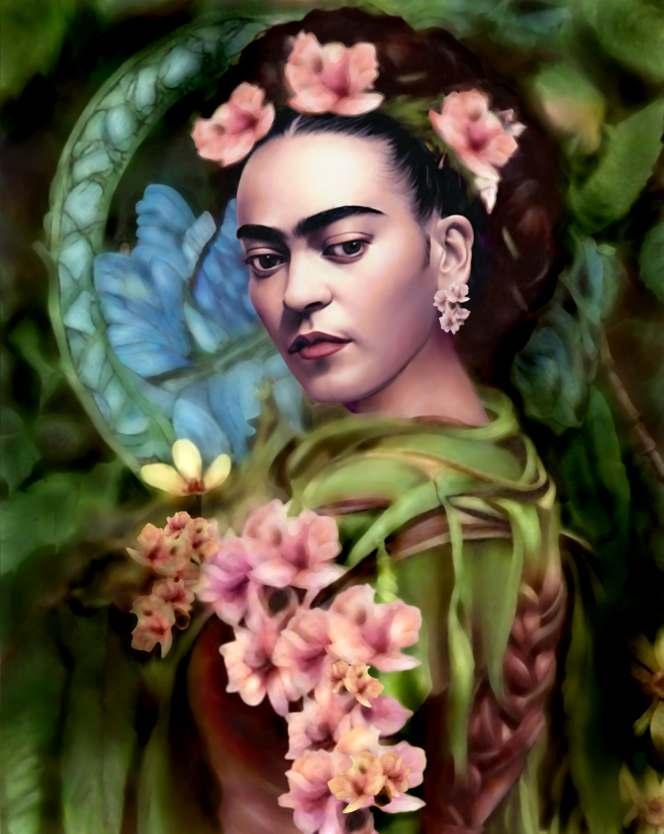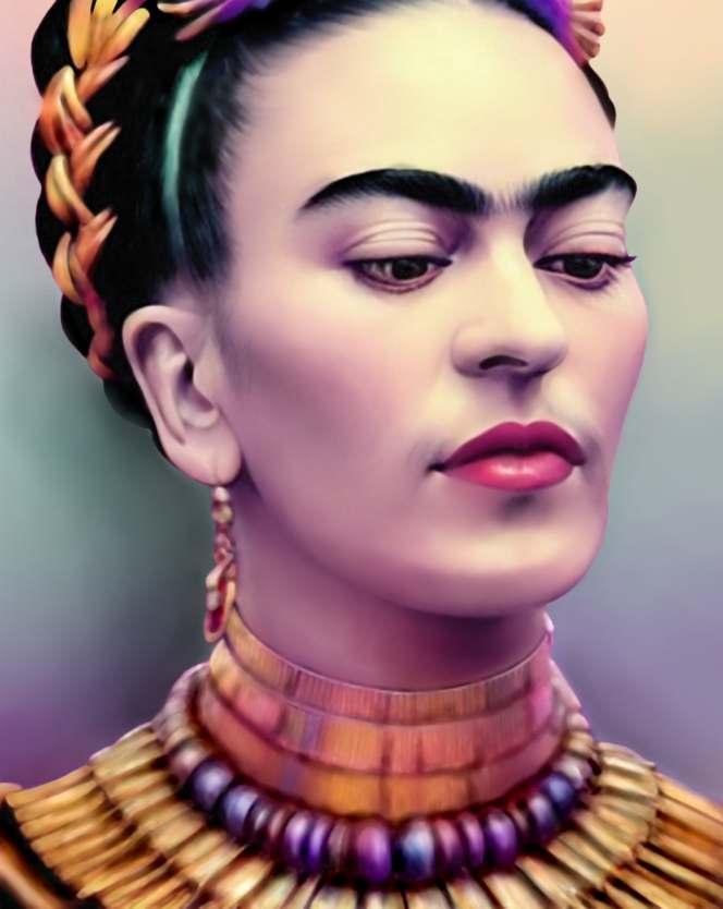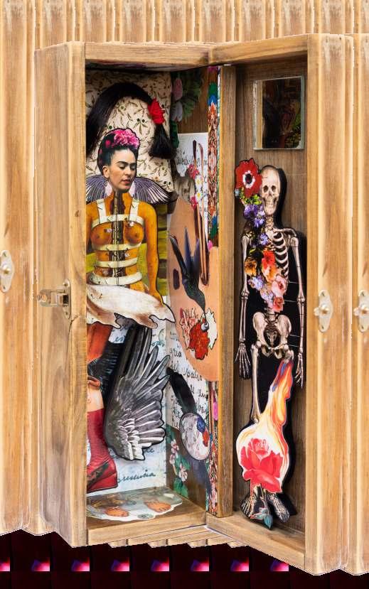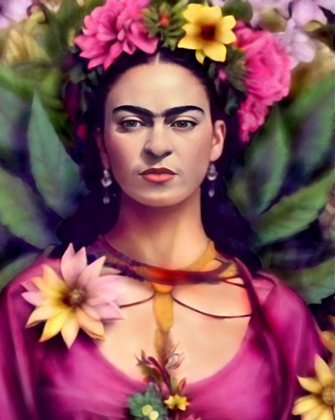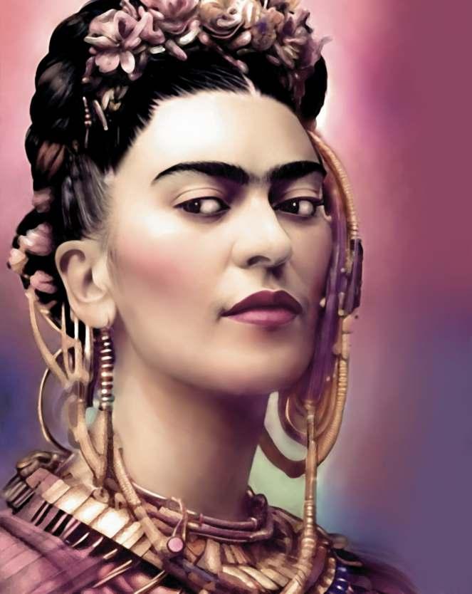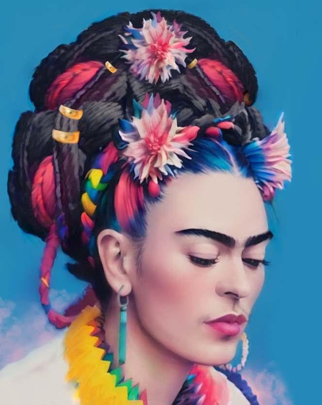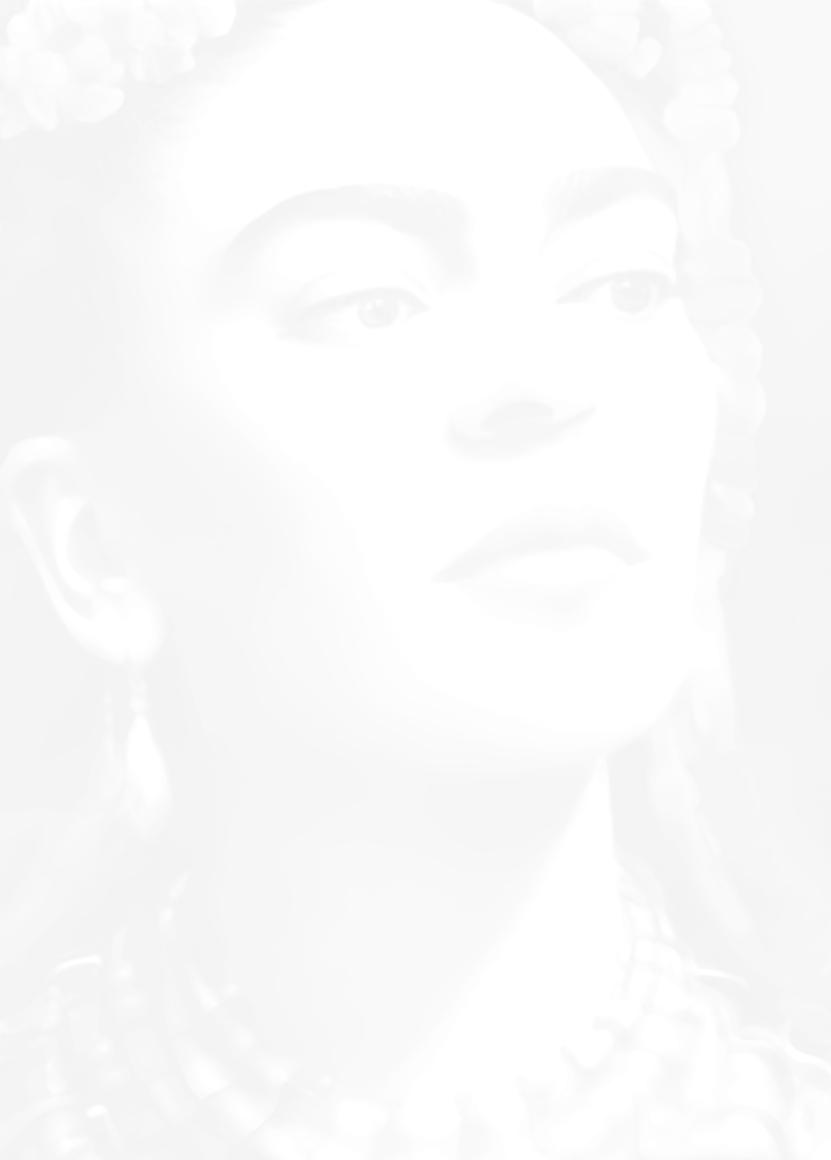Frida mostra sua força, suas mãos estão à altura do coração o que nos sugere uma identificação entre ela e as rosas. Os desenhos das folhas formam veias que se conectam. É como o sangue nas veias, pulsa garantindo vida a ela e às rosas. Frida não fica na história, ela fazhistóriaechegaaosdiasdehojedespojada,ondearoupaconfortávelpermitedesenvoltura necessária para o agir da mulher contemporânea. É uma Frida de atitude, irreverente e inquebrantável.Nãoimportaotempo,sempreteremosFrida.Elapodeestaraoseuladoouser você,porquenão?